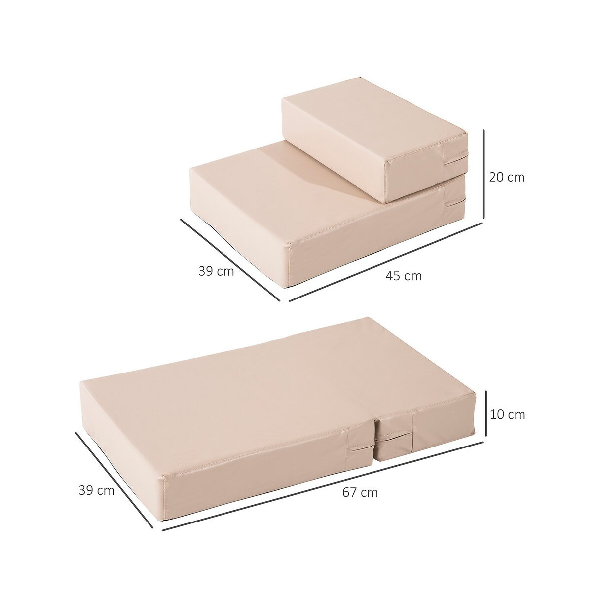 Cet escalier pour animaux de compagnie design 2-en-1 de PawHut est utilisé comme un escalier et se déplie comme un coussin pour que les animaux y dorment confortablement. Il est un choix optimal pour les chiots ou chiens âgés, convalescents en les aidant à atteindre facilement des endroits plus élevés. Il permet à votre animal d'accéder indépendamment aux canapés, au lit. Et son apparance élégante avec revêtement synthétique s'intègre parfaitement à toutes les pièces intérieures. Alors, n'hésitez pas ! Caractéristiques : - Escalier coussin 2 en 1 pour chiens ou chat grand confort : revêtement revêtement synthétique, garnissage mousse haute densité - Utilisation très pratique au quotidien : escalier ou coussin au choix - Equipement indispensable pour tous les chiens ou chats agés ou convalescents (maux de dos, articulations, etc...) - Revêtement synthétique déhoussable pour un entretien facile, pratique - Aucun montage à effectuer, utilisation immédiate possible ! Spécifications : - Couleur : beige - Matériaux principaux : revêtement synthétique, garnissage mousse - Dim. pliées : 45L x 39l x 20H cm - Dim. dépliées : 67L x 39l x 10H cm - Épaisseur mousse : 10 cm - Livraison effectuée en un colis - Réf. : D06-009Spécifications techniques