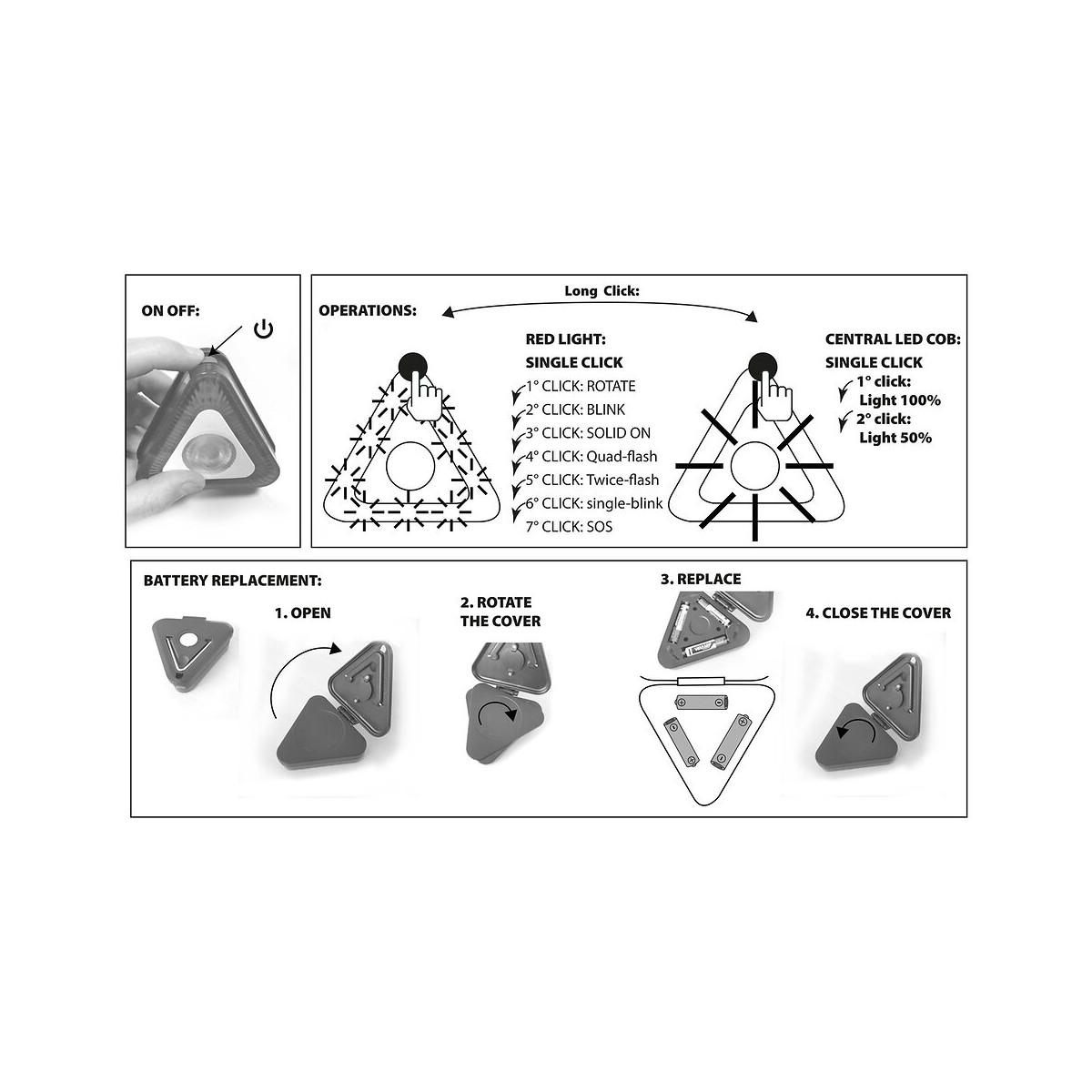 Triangle LED haute luminosité 7 effets: simple, double, quadruple clignotant, SOS .... Et torche centrale COB 300 lumen, à double intensité: 100% ou 50% de lumière. Fonctionne avec 3 piles AAA non fournies. Longue autonomie: la torche centrale garantit au moins 24 heures de lumière! Équipé d'un aimant et d'un crochet, il peut être accroché n'importe où: pratique pour le capot de la voiture! Structure résistante en ABS et finitions raffinées.Idéal à garder en voiture, camping-car, randonnée, camping.... Attention: le triangle lumineux IS419 ne se substitue en aucun cas le triangle d'urgence obligatoire dans l'équipement de bord de votre véhicule.