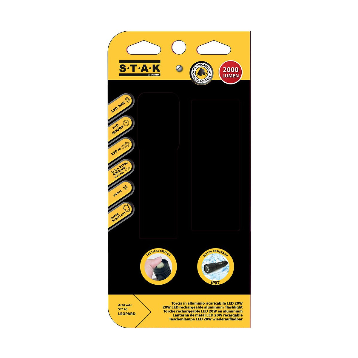 Puissante : équipée d'une LED haute puissance 20W, la torche STAK développe 2000 lumens sur 4 paliers : lumière 40% , lumière 15%, lumière 3%, 100% turbo, stroboscope. Rechargeable : jusqu'à 11 heures d'autonomie. Equipé d'une batterie Li-ion 4000 mAh 21700. Fabriquée en aluminium de qualité A ultraléger et résistant. IPX7 étanche peut être utilisée aussi bien à l'intérieur qu'à l'extérieur. Faisceau focalisé hyper puissant. LEOPARD est livré avec son étui, son câble de charge et sa batterie de 4000mAh. Parfaite pour la randonnée, le camping, en voiture, en industrie, à la ferme, sur le chantier, pour les forces de sécurité et les professionnels.