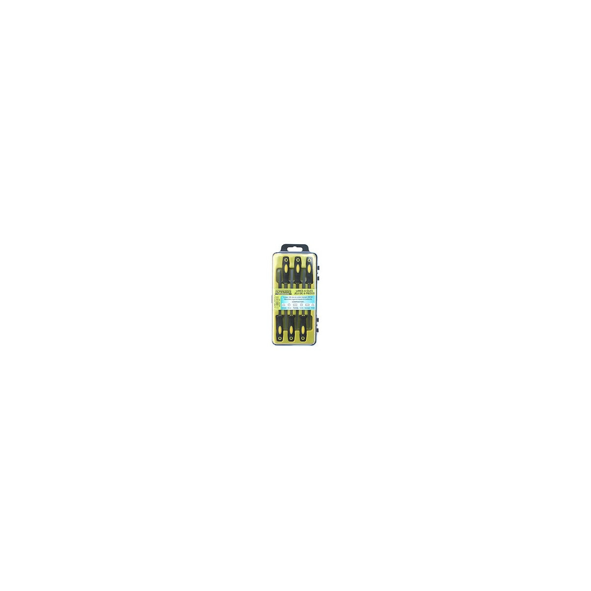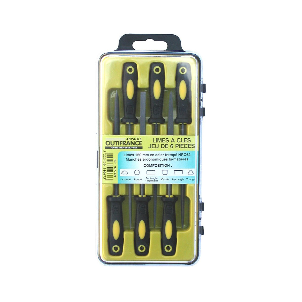 Jeu de 6 limes douces en acier trempé HRC62. Manche bi-matière. Longueur : 100 mm. Composition : 1 lime 1/2 ronde - 1 lime ronde - 1 lime carrée - 1 lime plate avec 1 bord lisse - 1 lime plate pointue - 1 lime triangle.En coffret plastique.