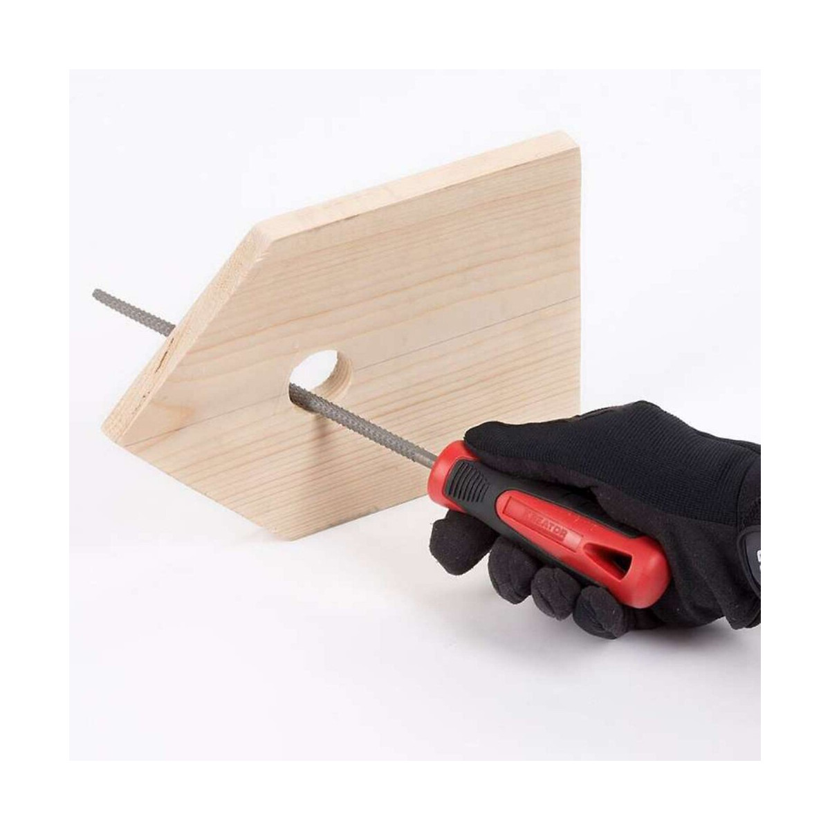Caractéristiques techniques: produit: râpe à bois marque: Kreator type: ronde matière: acier A3 ultra-résistant longueur lame: 200 mm poignée ergonomique en caoutchouc TPR confortable de 115 mm idéale pour modeler, agrandir les trous ou travailler les finitions du bois forme ronde adaptée pour l'agrandissement des trous coloris: rouge et noir poids: 0,142 kg