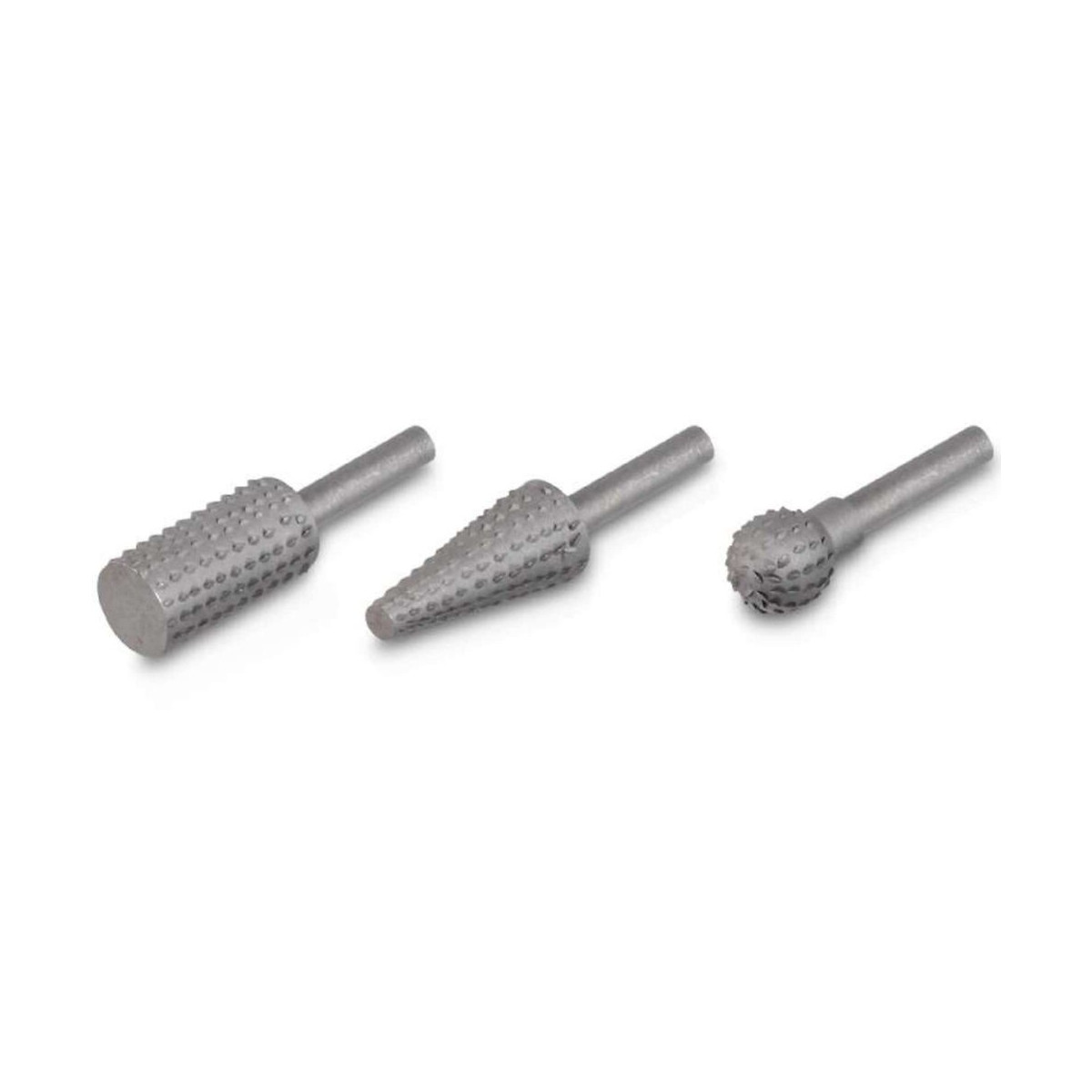 Jeu de 3 râpes à bois Kreator pour perceuse comprenant: 1 râpe cylindrique 1 râpe conique 1 râpe sphérique Diamètre de l'axe: 6mm