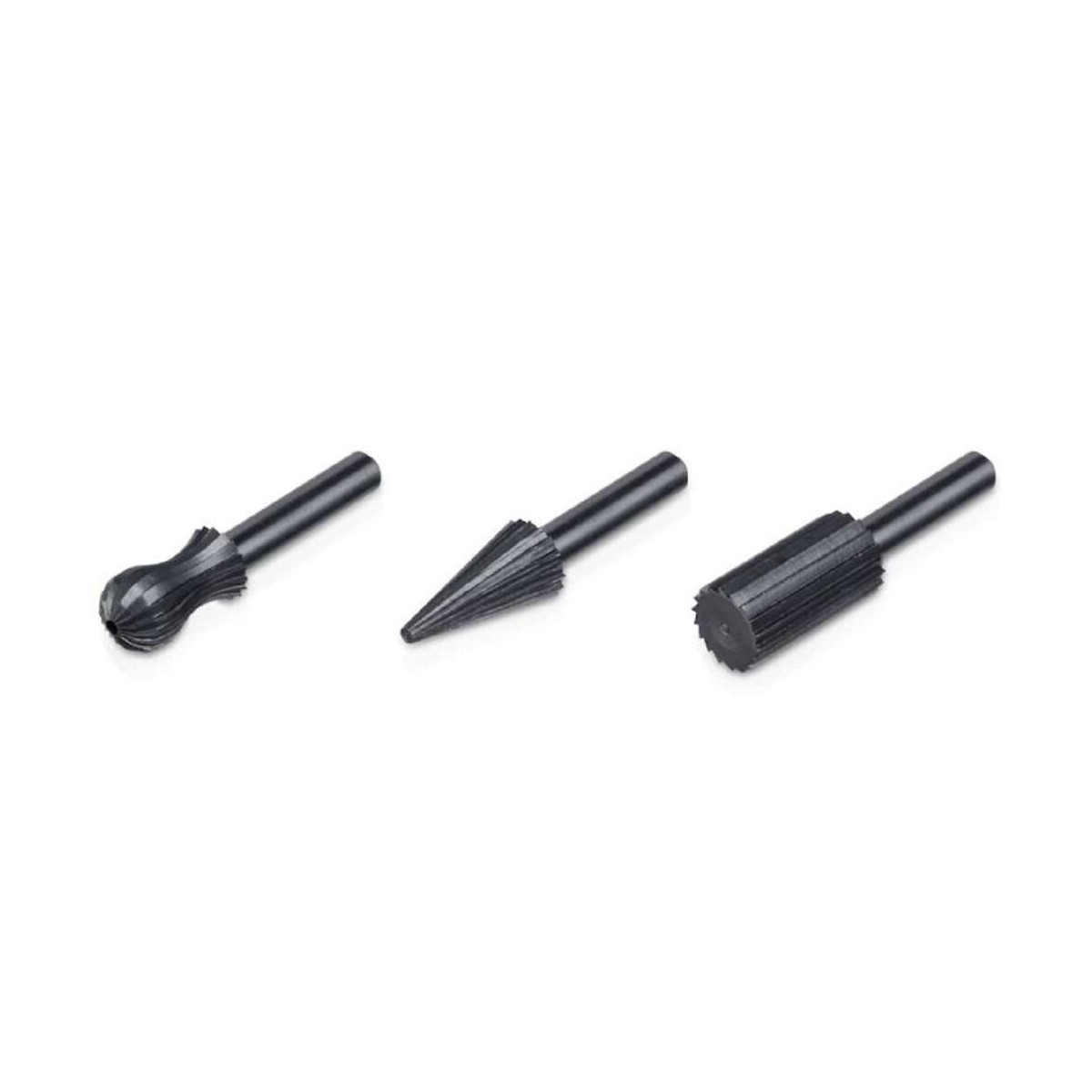 Jeu de 3 râpes Kreator bois et métal pour perceuse comprenant: 1 râpe cylindrique 1 râpe conique 1 râpe sphérique Diamètre de l'axe: 6mm