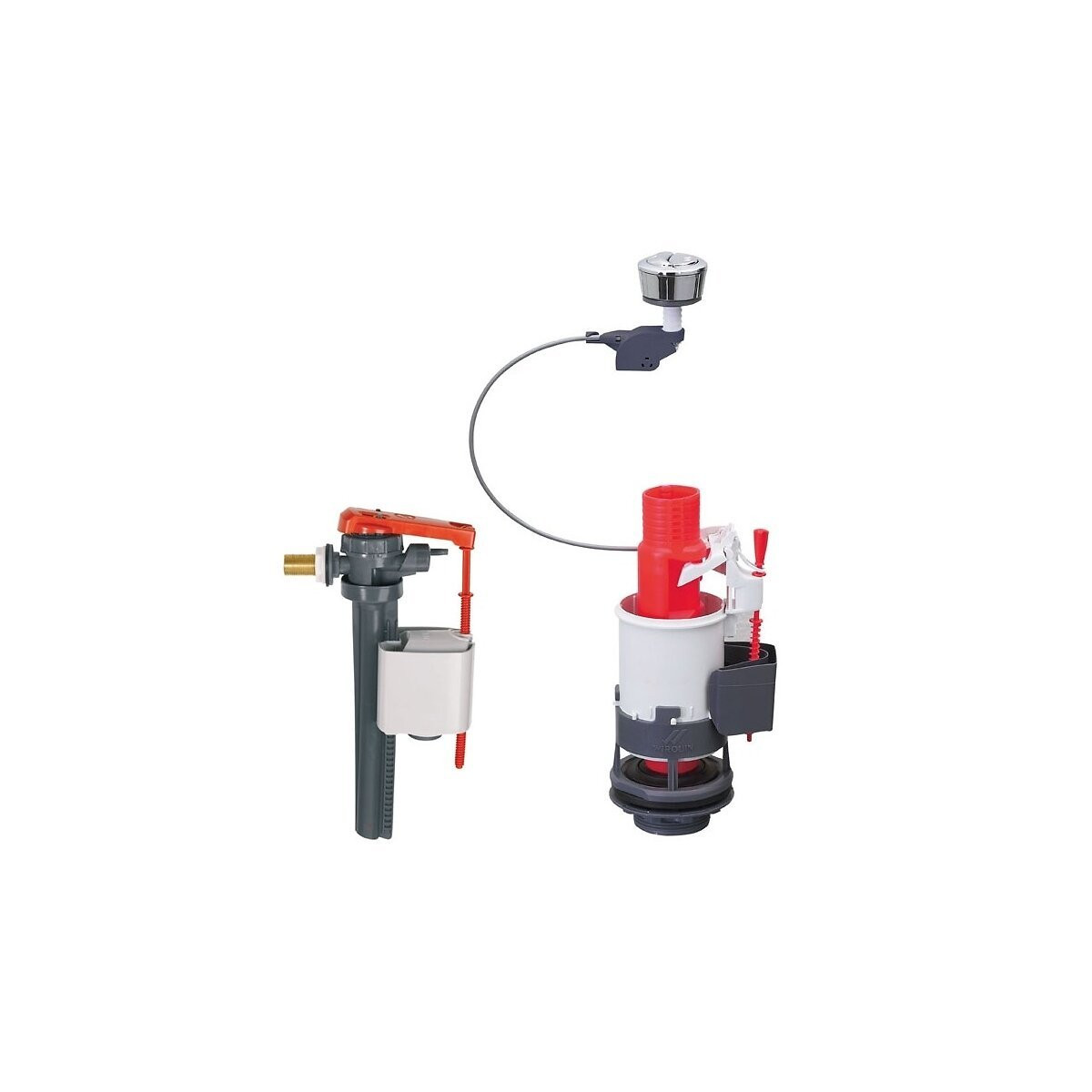 Ensemble complet de chasse à cable double poussoir 3/6L universel Alimentation latérale Cet ensemble contient : une soupape un bouton poussoir double volume : Petit bouton = petite chasse 3 L Grand bouton = grande chasse 6 L un robinet flotteur silencieux un cache trou latéral un kit de fixation réservoir-cuvette + un joint