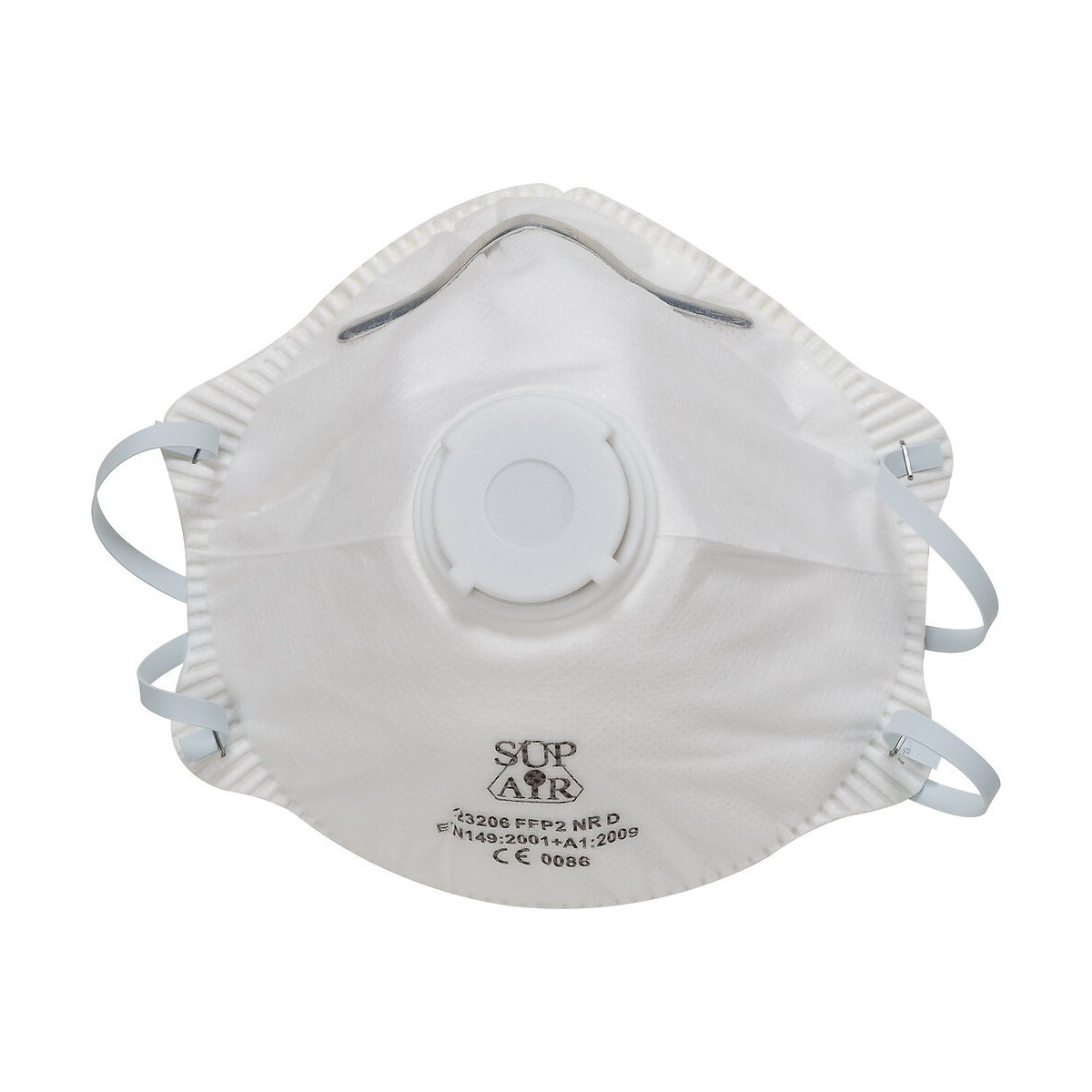 Masque jetable en polypropylène et polyester - Soupape d'expiration - Média filtrant électrostatique, barrette nasale réglable et coussinet nasal de confort. Bandeau élastique sans latex. Par 3.