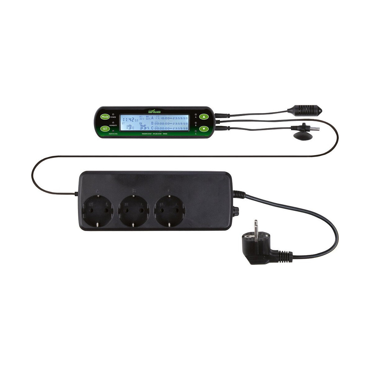 Thermostat/Hygrostat digital Dimensions: 16 × 4 cm Modèle: CR 2016 Thermostat/Hygrostat digital trois circuits pour le fonctionnement diurne et nocturne avec un raccordement de contrôle de la température et un raccordement de contrôle de lhumidité ainsi quun raccordement pour le timer parfait pour lutilisation de brumisateurs ou autres sources dhumidité afin de garantir lhumidité nécessaire permet le contrôle d'une source de chaleur en fonction de la température ainsi que le contrôle d'une source d'humidité en fonction de l'humidité de jour comme de nuit usage parfait avec les lampes et tapis chauffants et autres sources de chaleur afin déviter toute surchauffe ou hypothermie chaque circuit permet jusquà 8 programmations de ON/OFF affichage permanent de la température, de lhumidité, du temps réel et de la fonction choisie timer intégré (cycle min. 1 seconde) échelle de 0 °C à 50 °C variation de réglage de 1 °C à 15 °C plage de contrôle de lhumidité de 20 à 90 % s'utilise pour réchauffer ou refroidir longueur de câble de capteur : 2 × 180 cm fonction d'alarme visuelle capacité maximum 3 × 400 W la pile conserve les données en cas de coupure de courant Thermostat/Hygrostat digital Dimensions: 16 × 4 cm Modèle: CR 2016 Photo non contractuelle, car il y a plusieurs vendeurs sur une même fiche produit.