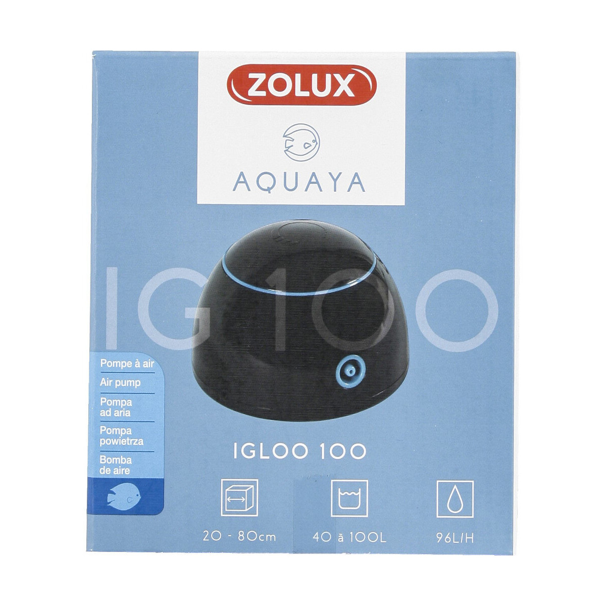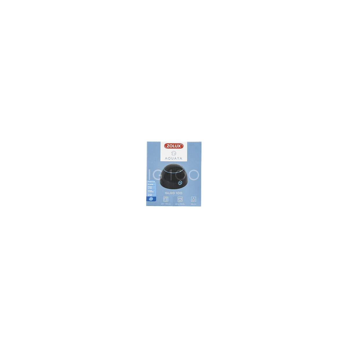 La pompe à air Igloo pour aquarium ZOLUX à un débit réglable est adaptée aux aquariums de 40 à 100 L. Avec un débit 96 L/H maximum. La pompe igloo 100 à une seul buse de sortie d'air. Un diffuseur d'air. Un clapet anti-retour. Un tuyau d'air d'environ 2 m. La pompe à air Igloo pour aquarium ZOLUX à un débit réglable est adaptée aux aquariums de 40 à 100 L. Avec un débit 96 L/H maximum. La pompe igloo 100 à une seul buse de sortie d'air. Un diffuseur d'air. Un clapet anti-retour. Un tuyau d'air d'environ 2m. Photo non contractuelle, car il y a plusieurs vendeurs sur une même fiche produit.