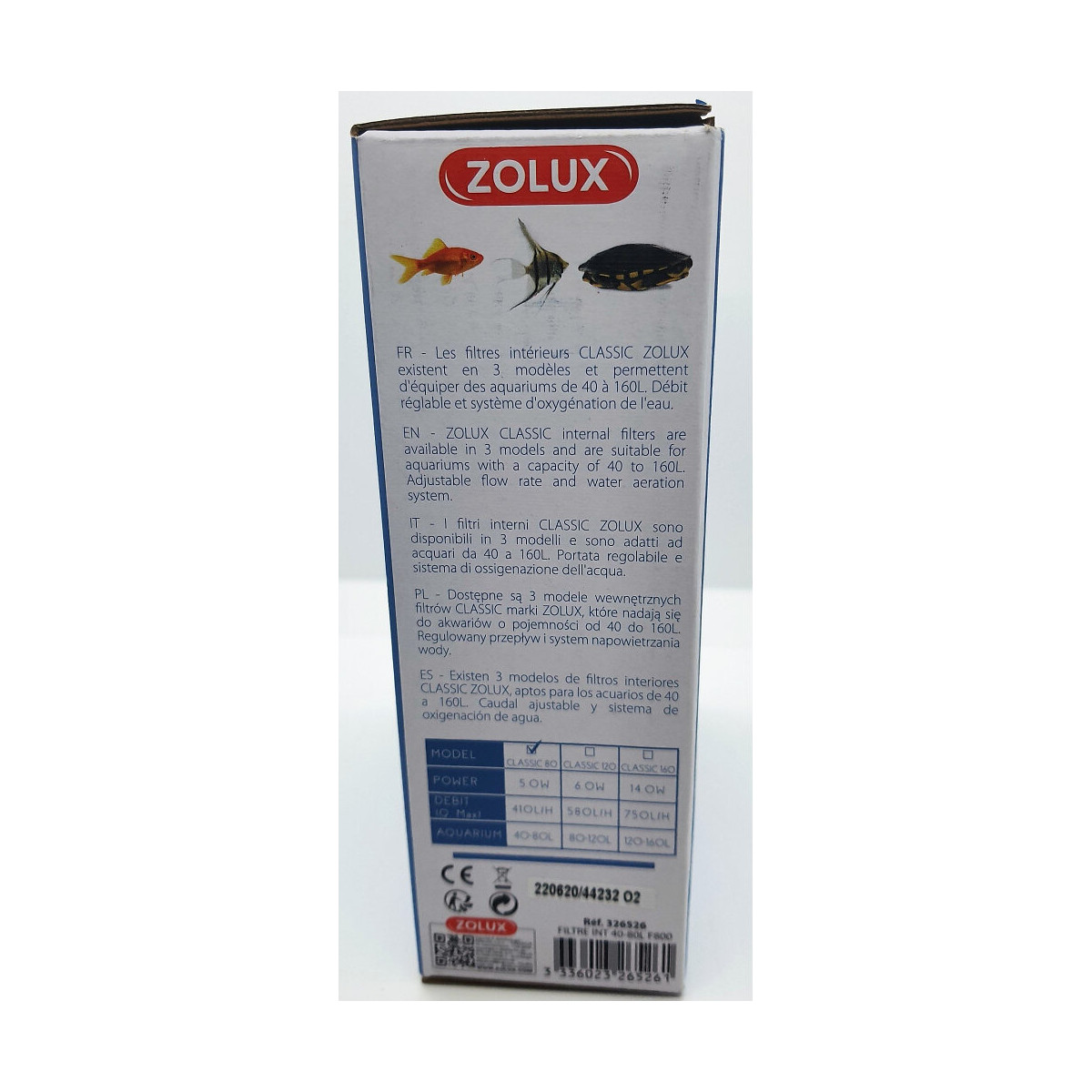 Le filtre intérieur classic 80 zolux permet d'équiper des aquariums de 40 à 80 L. Équiper du buse rotative. Réglable du débit/ facilité d'entretien. Inclus : CO80B perlon filtration des particules fines. CO80Al mousse bleue medium filtration des grosses particules. Convient pour les aquarium de 40 à 80 L. Avec un débit maximal de 410L/H. Le filtre intérieur classic 80 zolux permet d'équiper des aquariums de 40 à 80 L. Équiper du buse rotative. Réglable du débit/ facilité d'entretien. Inclus : CO80B perlon filtration des particules fines. CO80Al mousse bleue medium filtration des grosses particules. Convient pour les aquarium de 40 à 80 L. Avec un débit maximal de 410L/H. Photo non contractuelle, car il y a plusieurs vendeurs sur une même fiche produit.