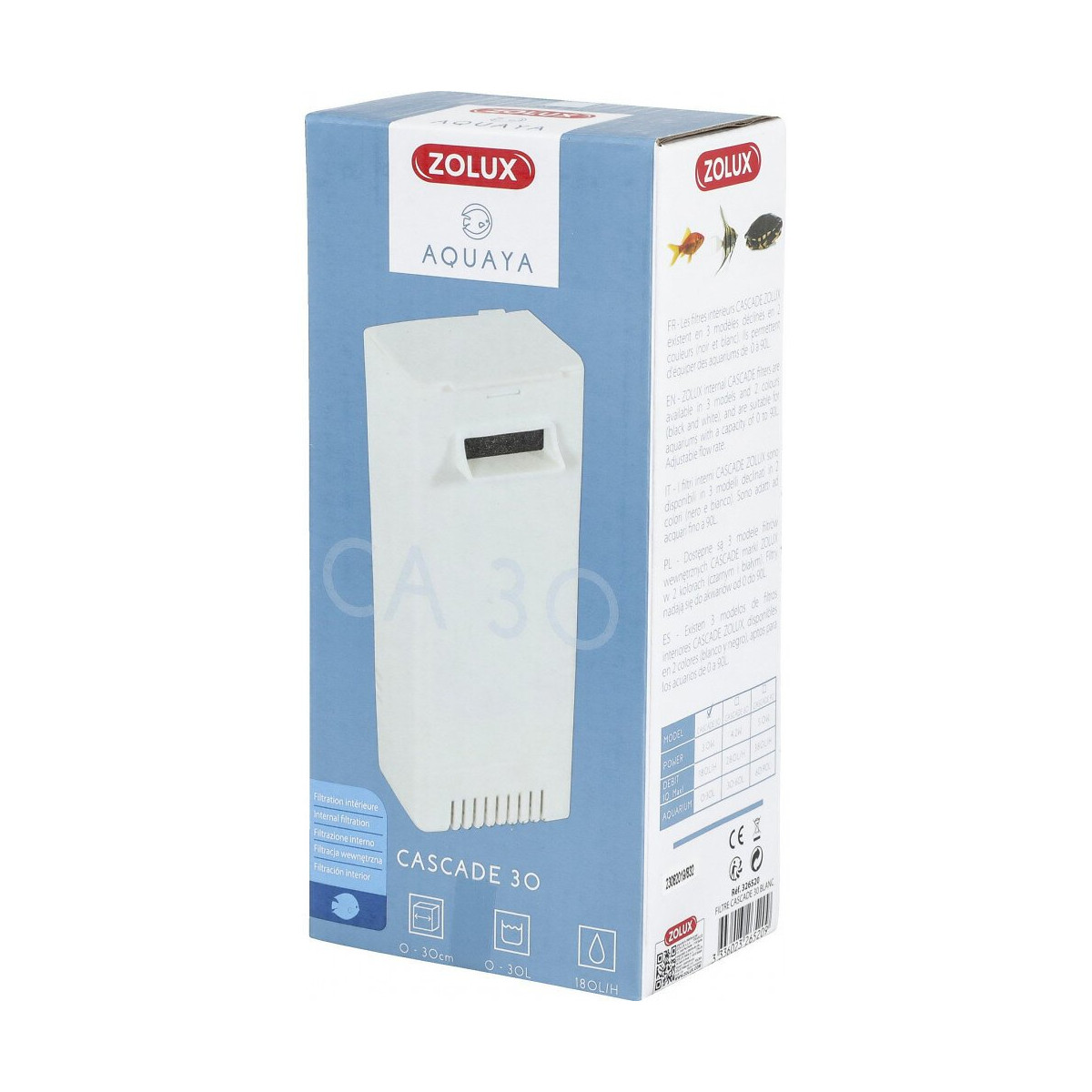 Le fitre cascade zolux permettent d'équiper des aquariums de 0 à 30 litres. Avec une buse de sortie d'eau, facilité d'entretien. Inclus : CA30A mousse bleue medium : filtration des grosses particules. CA30C cartouche ZEOCARB : rend l'eu cristalline et absorbe les résidus médicamenteux. coloris blanc. Le fitre cascade zolux permettent d'équiper des aquariums de 0 à 30 litres. Avec une buse de sortie d'eau, facilité d'entretien. Inclus : CA30A mousse bleue medium : filtration des grosses particules. CA30C cartouche ZEOCARB : rend l'eu cristalline et absorbe les résidus médicamenteux. Idéal pour les aquariums jusqu'à 30 litres, ce filtre cascade au débit préréglé est facile d'utilisation et d'entretien et sera particulièrement apprécié des amateurs d'aquariophilie. Débit de 180 Litre / Heure. Consommation : 3W. Fournit avec 2 masse de filtrations : Zeocarb Cascade 30 (mousse avec charbon actif pour l'épuration chimique de l'eau) et Foam Cascade 30 (mousse bleue permettant une filtration mécanique de l'eau). Dimensions filtre : L 6 x p 4,5 x h 14 cm. Coloris : blanc Photo non contractuelle, car il y a plusieurs vendeurs sur une même fiche produit.