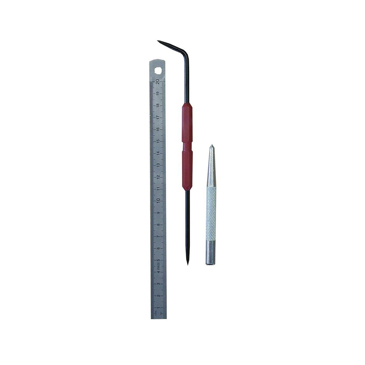 Le kit mécanicien comprend 1 reglet inox 20 cm + 1 pointeau + 1 pointe à tracer.