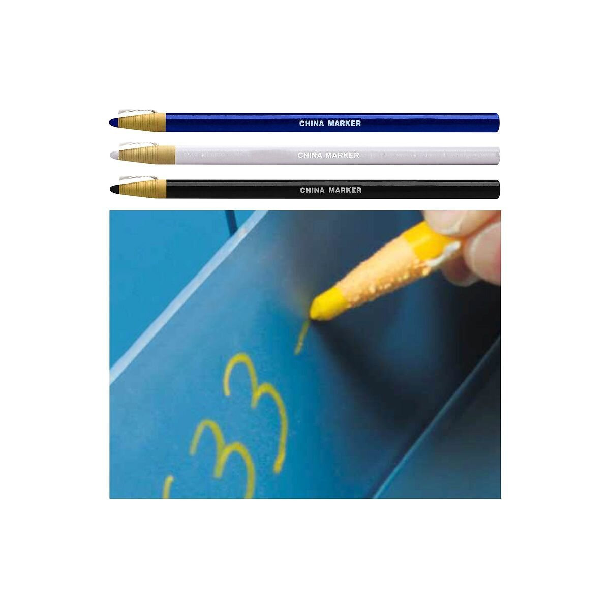 1 crayon blanc 170 mm Polyvalents, ces crayons à pointe en cire écrivent clairement sur n'importe quel matériau lisse, poreux ou non poreux, tels que verre, porcelaine, plastique, film, métal, caoutchouc, etc. Marquages très résistants dans le temps, qui s'effacent facilement avec un chiffon humide. Système d'affûtage ingénieux : en tirant sur une cordelette enroulée autour du marqueur, on déballe un nouveau morceau de la pointe en cire.