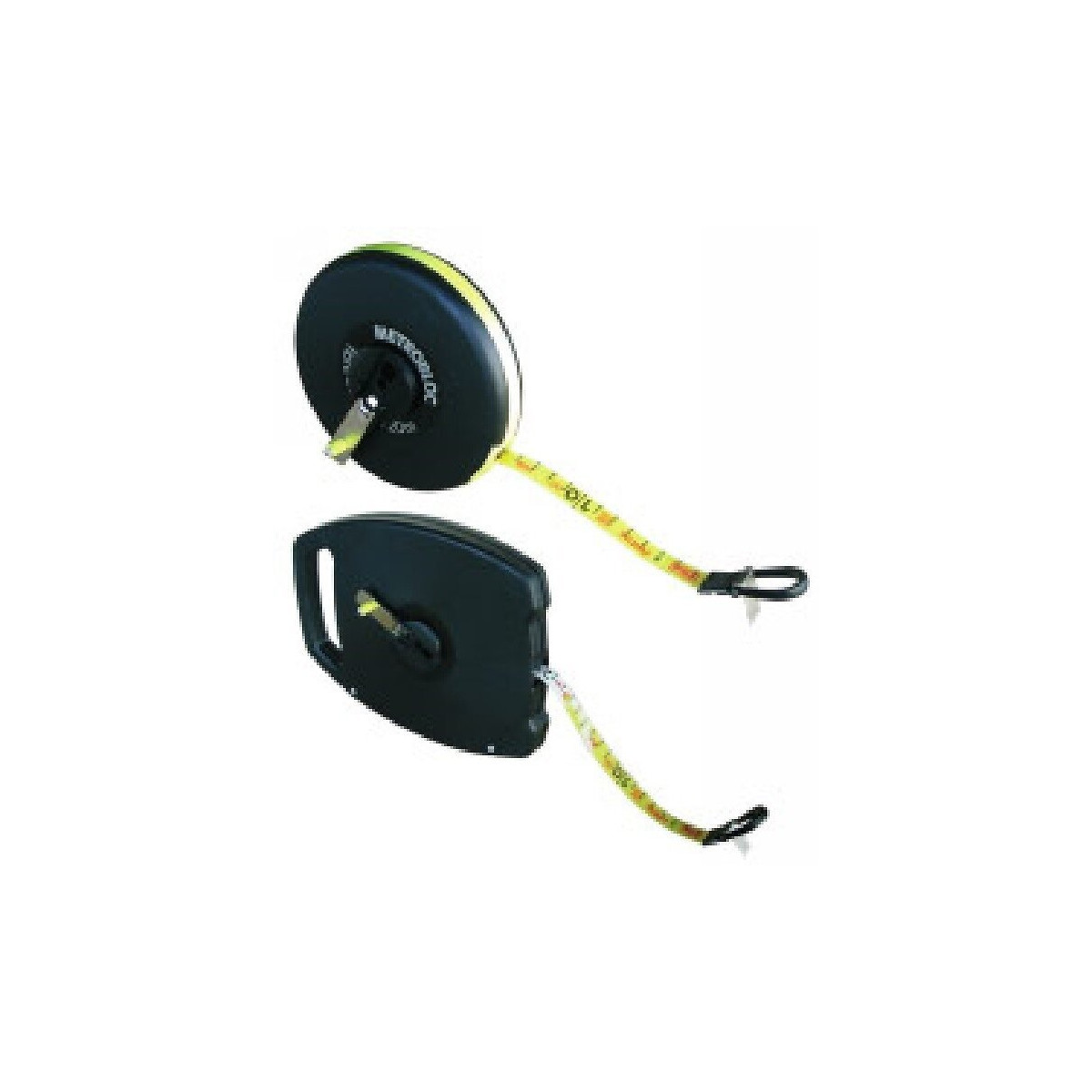 Boîtier en matière synthétique avec manivelle. Ruban fibre de verre avec crochet et anneau de fixation. Largeur 16 mm