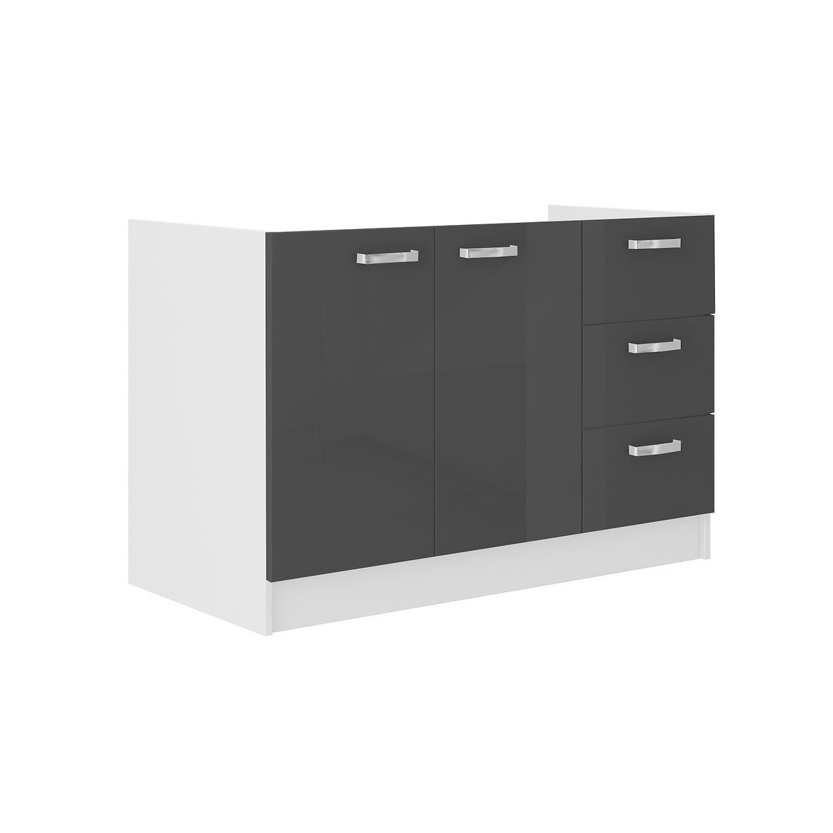 Meuble sous évier de 120, 2 portes, 3 tiroirs, gris. Panneau mélaminé 16mm,chant des bords etroits mélaminé 0,4 mm, charnières métallique diamètre 35 mm soft close, poignée métal.Spécifications techniques