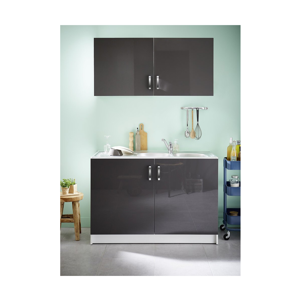 Meuble sous évier de 120, 2 portes, gris. Panneau mélaminé 16mm, chant des bords etroits mélaminé 0,4 mm, charnières métallique diamètre 35 mm soft close, poignée métal.Spécifications techniques