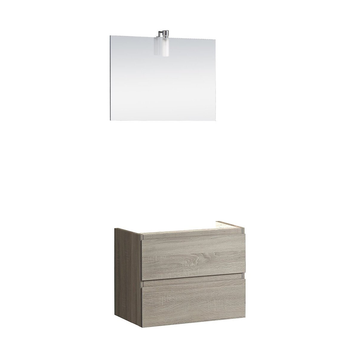 Caisson meuble sous vasque Sweet wood 60cm + miroir. Dimensions: L 590 x l 450 x H 500 mm.Coloris : décor bois. Structure en panneau de particules 16mm, côtés décor bois, façades décor bois en MDF 15mm. 2 tiroirs équipés de coulisses soft close. Fourni avec une paire d'attaches murales. Miroir L.600 x H.450 x Ep.15mm.Panneau de particules 12mm avec chants PVC décor bois. Miroir de 3mm collé. Fourni avec attaches murales. Eclairage de type IP 44 class II fourni sans ampoule.