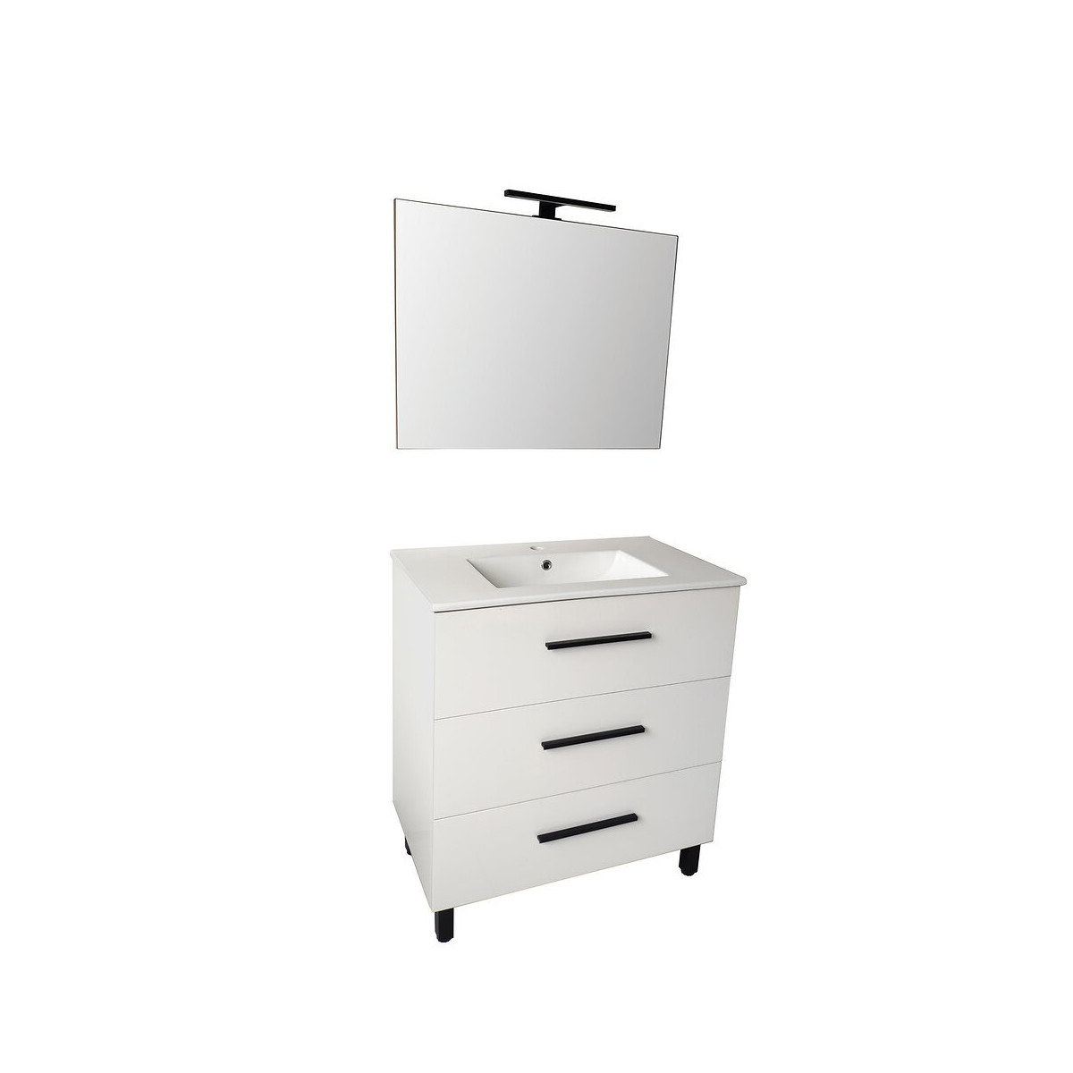 Meuble Nama pour plan vasque ceramique - coloris blanc - Dimesions : 80 x 46 x 88 cm ,- 3 tiroirs avec femeture lente - poignées métal - sur pieds - en melaminé et MDFSpécifications techniques