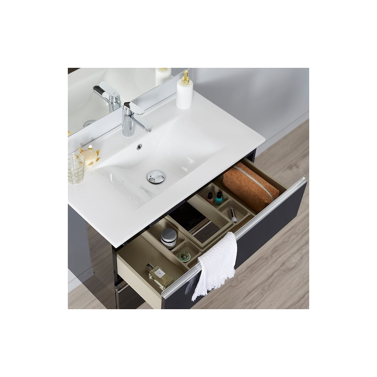 Notre ensemble meuble de salle de bain 80 cm Dynamic est équipé - d'un plan vasque en porcelaine blanc - d'un meuble de salle de bain finition laqué 80cm à suspendre - d'un miroir en 80x80 cm - d'une applique Led MEUBLE : Notre meuble de salle de bain est composé d'une structure en panneau de particules mélaminé 16 mm et de façades mélaminés en 16 mm. Celui-ci intègre deux tiroirs avec rail dissimulé en aluminium brillant à extraction partielle avec fermeture soft close et réglable en hauteur. Les façades sont en finition laquées. Le premier tiroir est équipé d'un organisateur de tiroir. Le meuble intègre un vide sanitaire de 45 mm + Produit du meuble: Facilité de nettoyage grâce aux finitions peintures laquées. Bonne capacité de stockage grâce aux 2 tiroirs et au séparateur de rangement inclus dans le meuble. Couleur : noir brillant Dimensions du meuble : L79.7 x H54 x P45 cm Poids : 23.5 kg PLAN VASQUE : Notre plan vasque est en porcelaine blanc. Ce plan vasque est équipé d'une plage de robinetterie et d'un trop plein. Il vous sera livré sans robinetterie, ni vidage. + Produit de la porcelaine : Très résistante aux rayures et a une utilisation très régulière, sans perde sa brillance. Haute résistance aux produits d'entretiens corrosifs. Dimension du plan vasque : L81 x H2 x P46 cm Poids : 13.2 kg MIROIR ET ÉCLAIRAGE : Dimension du miroir : L80 x H80 x P5 cm Une applique led inclus Dimension de l 'applique : L20.8 x H3.2 x P11.2 cm Ce meuble existe en 60cm INSTALLATION FACILE : Meuble 100% monté en usine Fabrication Européenne