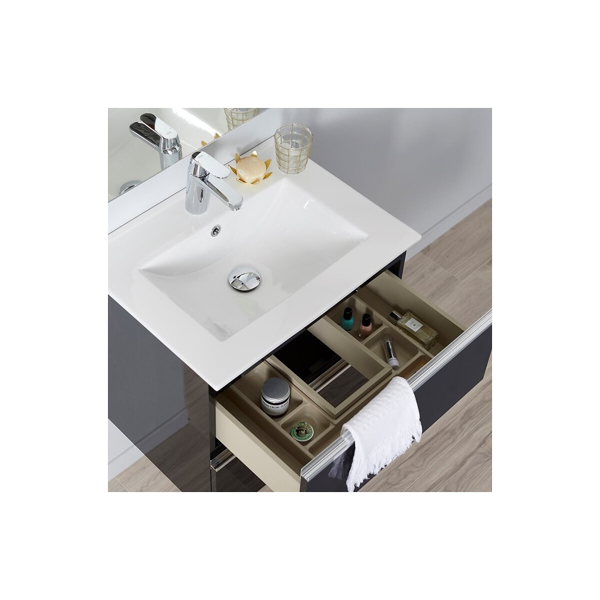 Notre ensemble meuble de salle de bain 60 cm Dynamic est équipé - d'un plan vasque en porcelaine blanc - d'un meuble de salle de bain finition laqué 60cm - d'un miroir en 60x80 cm - d'une applique Led MEUBLE : Notre meuble de salle de bain est composé d'une structure en panneau de particules mélaminé 16 mm et de façades mélaminés en 16 mm. Celui-ci intègre deux tiroirs avec rail dissimulé en aluminium brillant à extraction partielle avec fermeture soft close et réglable en hauteur. Les façades sont en finition laquées. Le premier tiroir est équipé de rangement. Le meuble intègre un vide sanitaire de 45 mm + Produit du meuble: Facilité de nettoyage grâce aux finitions peintures laquées. Bonne capacité de stockage grâce aux 2 tiroirs et au séparateur de rangement inclus dans le meuble. Couleur : noir brillant Dimensions du meuble : L59.8 x H54 x P45 cm Poids : 20 kg PLAN VASQUE : Notre plan vasque est en porcelaine blanc. Ce plan vasque est équipé d'une plage de robinetterie et d'un trop plein. Il vous sera livré sans robinetterie, ni vidage. + Produit de la porcelaine: Très résistante aux rayures et a une utilisation très régulière, sans perde sa brillance. Haute résistance aux produits d'entretiens corrosifs. Dimension du plan vasque : L61 x H1.6 x P46 cm Poids : 12.3 kg MIROIR ET ÉCLAIRAGE : Dimension du miroir : L80 x H60 x P5 cm Une applique led inclus Dimension de l 'applique : L20.8 x H3.2 x P11.2 cm Ce meuble existe en 80cm INSTALLATION FACILE : Meuble livré monté Fabrication Européenne