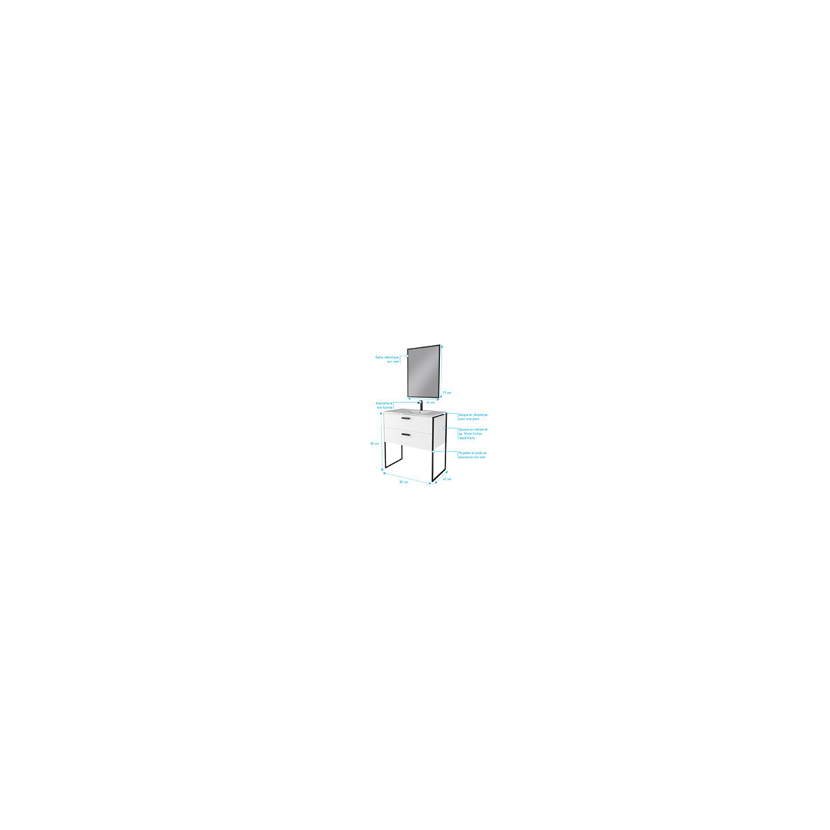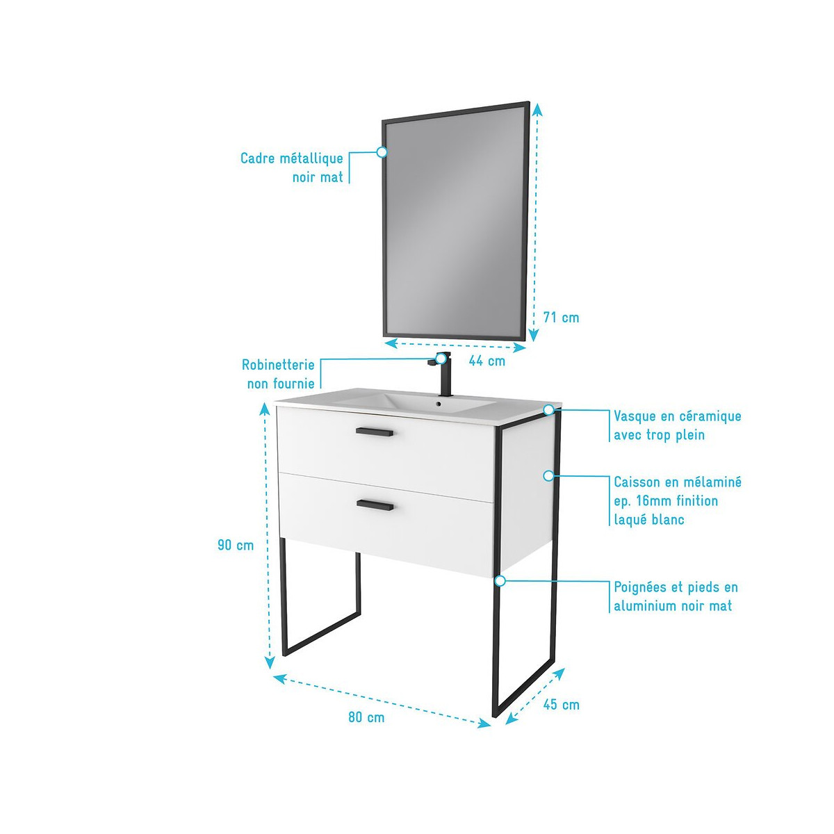 Pack meuble couleur blanc laqué + miroir cadre laqué noir mat + vasque céramique blanche Caractéristique du pack meuble : Caisson en MDF et mélaminé finition laqué blanc ép. 16mm tiroirs finition laqués blanc ép. 16mm à fermeture progressive Poignés et pieds aluminium laqués noir mat Plan vasque céramique blanche avec trop plein Miroir avec cadre aluminium laqué noir mat 74x44cm Dimensions du meuble : 90x80x45cm Dimensions du miroir : 71x44cm Meuble sur pieds livré monté Robinetterie non fournie Réference du produit: LAV608 Désignation du produit: INDUSTRY WHITE Garantie 2 ans pièces et non main d'oeuvre. Profilé noir mat thermolaqué : Le thermolaquage est une technique de traitement spécifique réservé aux matériaux en métal ou en aluminium brut. On projette de la peinture en poudre chargée en électricité statique qui va se déposer sur toute la surface des profilés. Cette technique de pulvérisation en poudre , qui s’appelle projection électrostatique ou poudrage électrostatique, permet d'avoir un revêtement complètement uniforme sur tous les profilés. Ce type de traitement dispense l’utilisation de produits chimiques nocifs pour la santé et l’environnement comme les solvants. Après avoir été recouverte de poudre, la pièce doit passer dans un four où elle sera chauffée pendant 20 minutes à 200°C. Les avantages du thermolaquage : Cette technique possède de nombreux avantage, qui sont La surface peinte possède une dureté supérieure ce qui a pour conséquence une résistance aux chocs accrue Le thermolaquage a une meilleure résistance à la corrosion La couleur des profilés thermolaqués résiste mieux au vieillisement et tout autres élément tel que l'humidité etc. Les profilés thermolaqués présentent une meilleure finition, fini les coulures de peinture et défauts d'aspect, avec cette technique la surface est uniforme Sans solvant c'est un véritable plus pour la santé Mais aussi plus écologique (pas de solvants) Dans un souci de qualité mais aussi de sécurité nos produits répondent à toutes les normes Européennes en vigeur. Que ce soit en terme de sécurité en cas de casse, d'entretien de nos produits ou de la durée de vie de ces derniers, nos produits remplissent tous les critères. Verre trempé : Le verre trempé est un verre qui a subi un traitement afin d’améliorer ses propriétés. Nous utilisons la trempe thermique qui consiste à porter le verre à très haute température (environ à 700 °C), puis de le refroidir rapidement. Ce processus favorise l'apparition de tensions en profondeur et celle de la compression à la surface du verre. Tout cela a pour effet l’amélioration de sa résistance aux chocs. Il est de 2 à 5 fois plus résistant que le verre simple. Mais aussi diminue grandement la dangerosité du verre car en cas de casse le verre explose en de petits morceaux et non pas en de grands pans tranchants. Pour le reste il conserve les mêmes propriétés que le verre classique Norme harmonisée : EN14428:2004 Certification Européenne: Aptitude au nettoyage : EN14428 :2004+A1:2008 Clause 4.2 Résistance à l’impact / Propriétés d’éclatement: EN14428:2004+A1:2008 Clause 4.3 Durabilité : EN14428:2004+A1:2008 Clause 4.4 MyShowerRoom c’est aussi la garantie de durabilité : Nous garantissons un stocks de pièces détachées d’au moins 5 ans Notre visserie est en acier inoxydable ce qui est une garantie anticorrosion Garantie 2 ans pièces uniquement Cocorico ! MyShowerRoom est une entreprise Française et toute la conception de nos produits est également Française. Ce qui est un véritable plus pour être au plus près de ses clients et avoir une meilleure connaissance de leurs attentes. Qui sommes nous L’HISTOIRE DE MYSHOWERROOM Nous avons créé MyShowerRoom en 2003 avec l’ambition de démocratiser le design et l’innovation dans la salle de bain pour faire de cette pièce un lieu à part entière, un véritable lieu d’histoires à vivre pour toute la famille. Nos cabines de douche et meubles de salle de bain dans l’ère du temps à des tarifs très accessibles. Nos nombreux brevets garantissent l’originalité de notre gamme de cabines de douches. Et nos ingénieurs mettent en œuvre tout leur savoir-faire et toutes les technologies innovantes au service d’une simplicité d’installation et d’utilisation incomparable pour tous. ÊTRE BIENVEILLANT AVEC NOS CLIENTS Notre service client a un objectif : rendre nos clients heureux. Pour cela nous veillons à répondre dans les 24h aux demandes clients. Mais aussi de toujours apporter une solution et entière satisfaction à nos clients. CONSTRUIRE DES PRODUITS TOUJOURS PLUS PERFORMANTS Nos ingénieurs, ainsi que nos équipes terrain consacrent tous leurs efforts à créer des produits adaptés à vos besoins, et toujours plus innovants grâce à nos technologies. Notre objectif est d’être votre unique interlocuteur pour tous vos projets de salle de bain. CONCRÉTISER LES RÊVES DE CHACUN Un projet de salle de bain ? Nous le réalisons ! Lieu de détente et de relaxation par excellence, la salle de bain est une des pièces maîtresse de la maison. Chez MyShowerRoom, nous mettons tout en oeuvre afin que ce rêve devienne réalité. PROPOSER UNE GAMME COMPLÈTE DE PRODUITS Nous vous proposons grâce à notre boutique en ligne une gamme complète de produits Made in MyShowerRoom pour équiper, et accessoiriser votre salle de bain. Un catalogue que nous renouvelons régulièrement avec les dernières technologies MyShowerRoom. APPORTER UNE EXPERTISE HUMAINE Parce que l’humain passe avant tout, nous travaillons avec les meilleurs experts. La satisfaction de nos clients est notre seule et unique priorité. Chaque problème a une solution, et c’est dans cette optique que nous avons mis en place un chat pour échanger directement avec nos équipes. NOTRE CENTRE LOGISTIQUE 11 000 m² d’entrepôt 7000 palettes en stock 1 80
