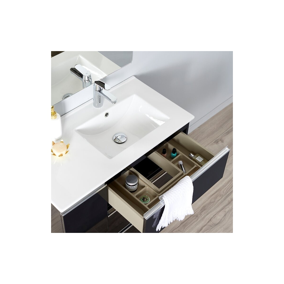 Cet ensemble de salle de bain à poser est composé d'un meuble à poser de 85 cm, d'un plan vasque, d'un miroir et de l'éclairage. MEUBLE : - Meuble en panneau de particules mélaminé laqué avec peinture haute brillance UV - épaisseur 16 mm - Façade en panneau de particules mélaminé laqué avec peinture haute brillance UV - épaisseur 16 mm - Finition des caissons et des façades de tiroirs laqués noir brillant - Meuble équipé de trois tiroirs avec rail dissimulé à extraction partielle en aluminium brillant - fermeture soft close et réglable en hauteur et d'une porte avec tablettes de rangement. - Le premier tiroir est équipé d'un organisateur de rangement. - Meuble à poser. - Ce meuble intègre un vide sanitaire pour faciliter le passage des évacuations - Meuble livré monté - Dimensions : L84.8 x H86.8 x P45 cm + Produit du meuble: Facilité de nettoyage grâce aux finitions peintures laquées. Bonne capacité de stockage grâce aux 3 tiroirs et au séparateur de rangement inclus dans le meuble. PLAN VASQUE : - Plan vasque en porcelaine blanc de 85.5 cm - Cuve décentrée à droite - Plage de dépose pour rangement - Plage de robinetterie et trop plein - Dimensions : L85.5xH1.6 xP46 cm - La robinetterie et le système de vidage non fournis + Produit de la porcelaine: Très résistante aux rayures et a une utilisation très régulière, sans perde sa brillance. Haute résistance aux produits d'entretiens corrosifs. MIROIR : - Applique Led inclus - Dimensions : L80 x H80 x P5 cm ÉCLAIRAGE : - Applique Led Dimension de l'applique : L20.8 x H3.2 x P11.2 cm INSTALLATION FACILE : Meuble 100% monté en usine Fabrication Europe Garantie 2 ans