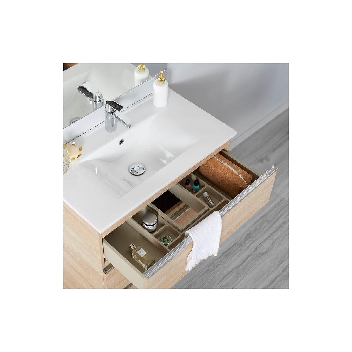 Notre ensemble meuble de salle de bain 80 cm Dynamic à poser est équipé - d'un plan vasque en porcelaine blanc - d'un meuble de salle de bain finition laqué 80cm à poser - d'un miroir en 80x80 cm - d'une applique Led MEUBLE : Notre meuble de salle de bain est composé d'une structure en panneau de particules mélaminé 16 mm et de façades en panneau de particules mélaminé en 16 mm. Celui-ci intègre trois tiroirs avec rail dissimulé à extraction partielle, fermeture soft close et réglable en hauteur. Les façades sont en finition décor chêne oak bordolino. Le premier tiroir est équipé d'un organisateur de rangement. Le meuble intègre un vide sanitaire de 45 mm + Produit du meuble: Facilité de nettoyage . Bonne capacité de stockage grâce aux 3 tiroirs et au séparateur de rangement inclus dans le meuble. Couleur : chêne oak bordolino Dimensions du meuble : L79.7 x H86.8 x P45 cm Poids : 35 kg PLAN VASQUE : Notre plan vasque est en porcelaine blanc. Ce plan vasque est équipé d'une plage de robinetterie et d'un trop plein. Il vous sera livré sans robinetterie, ni vidage. + Produit de la porcelaine: Très résistante aux rayures et a une utilisation très régulière, sans perde sa brillance. Haute résistance aux produits d'entretiens corrosifs. Dimension du plan vasque : L81 x H2 x P46 cm Poids : 15 kg MIROIR ET ÉCLAIRAGE : Dimension du miroir : L80 x H80 x P5 cm Une applique led inclus Dimension de l 'applique : L20.8 x H3.2 x P11.2 cm Ce meuble existe en 60cm et en 100cm INSTALLATION FACILE : Meuble 100% monté en usine Fabrication Européenne