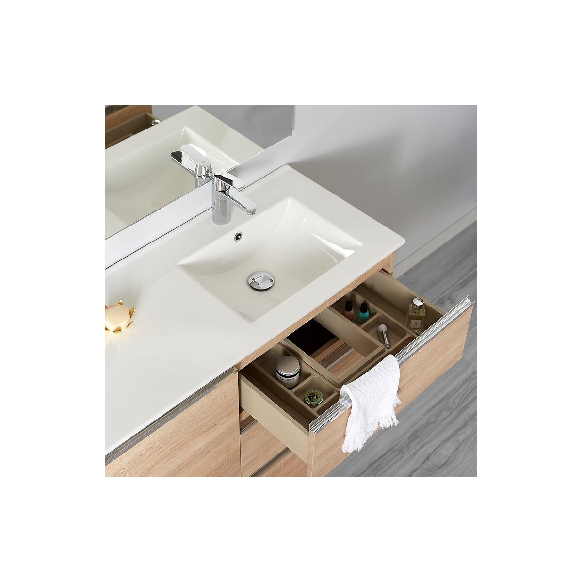 Cet ensemble de salle de bain à poser est composé d'un meuble à poser de 100 cm, d'un plan vasque, d'un miroir et de l'éclairage. MEUBLE : - Meuble en panneau de particules mélaminé - épaisseur 16 mm - Façade en panneau de particules mélaminé - épaisseur 16 mm - Finition des caissons et des façades de tiroirs décor chêne oak bordolino - Meuble équipé de trois tiroirs avec rail dissimulé à extraction partielle en aluminium brillant - fermeture soft close et réglable en hauteur et d'une porte avec tablettes de rangement. - Le premier tiroir est équipé d'un organisateur de rangement. - Ce meuble intègre un vide sanitaire pour faciliter le passage des évacuations - Meuble livré monté - Dimensions : L97.9 x H86.8 x P45 cm + Produit du meuble: Facilité de nettoyage . Bonne capacité de stockage grâce aux 3 tiroirs et au séparateur de rangement inclus dans le meuble. PLAN VASQUE : - Plan vasque en porcelaine blanc de 100.5 cm - Cuve décentrée à droite - Plage de dépose pour rangement - Plage de robinetterie et trop plein - Dimensions : L100.5xH1.6 xP46 cm - La robinetterie et le système de vidage non fournis + Produit de la porcelaine: Très résistante aux rayures et a une utilisation très régulière, sans perde sa brillance. Haute résistance aux produits d'entretiens corrosifs. MIROIR : - Applique Led inclus - Dimensions : L100 x H80 x P5 cm ÉCLAIRAGE : - Applique Led Dimension de l'applique : L20.8 x H3.2 x P11.2 cm INSTALLATION FACILE : Meuble 100% monté en usine Fabrication Europe Garantie 2 ans