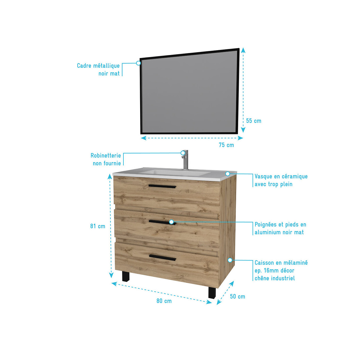 Pack meuble couleur chêne industriel + miroir avec cadre métallique noir mat + vasque céramique blanche Caractéristique du pack meuble : Caisson en mélaminé epaisseur 16mm décor chêne industriel tiroirs Poignés et pieds en aluminium noir mat Plan vasque céramique blanche avec trop plein Miroir avec cadre métallique noir mat Dimensions du meuble : 81x80x50cm Dimensions du miroir : 55x75cm Meuble sur pieds livré monté Robinetterie non fournie Réference du produit: LAV570 Garantie 2 ans pièces et non main d'oeuvre. Profilé noir mat thermolaqué : Le thermolaquage est une technique de traitement spécifique réservé aux matériaux en métal ou en aluminium brut. On projette de la peinture en poudre chargée en électricité statique qui va se déposer sur toute la surface des profilés. Cette technique de pulvérisation en poudre , qui s’appelle projection électrostatique ou poudrage électrostatique, permet d'avoir un revêtement complètement uniforme sur tous les profilés. Ce type de traitement dispense l’utilisation de produits chimiques nocifs pour la santé et l’environnement comme les solvants. Après avoir été recouverte de poudre, la pièce doit passer dans un four où elle sera chauffée pendant 20 minutes à 200°C. Les avantages du thermolaquage : Cette technique possède de nombreux avantage, qui sont La surface peinte possède une dureté supérieure ce qui a pour conséquence une résistance aux chocs accrue Le thermolaquage a une meilleure résistance à la corrosion La couleur des profilés thermolaqués résiste mieux au vieillisement et tout autres élément tel que l'humidité etc. Les profilés thermolaqués présentent une meilleure finition, fini les coulures de peinture et défauts d'aspect, avec cette technique la surface est uniforme Sans solvant c'est un véritable plus pour la santé Mais aussi plus écologique (pas de solvants) Dans un souci de qualité mais aussi de sécurité nos produits répondent à toutes les normes Européennes en vigeur. Que ce soit en terme de sécurité en cas de casse, d'entretien de nos produits ou de la durée de vie de ces derniers, nos produits remplissent tous les critères. MyShowerRoom c’est aussi la garantie de durabilité : Nous garantissons un stocks de pièces détachées d’au moins 5 ans Notre visserie est en acier inoxydable ce qui est une garantie anticorrosion Garantie 2 ans pièces uniquement Cocorico ! MyShowerRoom est une entreprise Française et toute la conception de nos produits est également Française. Ce qui est un véritable plus pour être au plus près de ses clients et avoir une meilleure connaissance de leurs attentes. Qui sommes nous L’HISTOIRE DE MYSHOWERROOM Nous avons créé MyShowerRoom en 2003 avec l’ambition de démocratiser le design et l’innovation dans la salle de bain pour faire de cette pièce un lieu à part entière, un véritable lieu d’histoires à vivre pour toute la famille. Nos cabines de douche et meubles de salle de bain dans l’ère du temps à des tarifs très accessibles. Nos nombreux brevets garantissent l’originalité de notre gamme de cabines de douches. Et nos ingénieurs mettent en œuvre tout leur savoir-faire et toutes les technologies innovantes au service d’une simplicité d’installation et d’utilisation incomparable pour tous. ÊTRE BIENVEILLANT AVEC NOS CLIENTS Notre service client a un objectif : rendre nos clients heureux. Pour cela nous veillons à répondre dans les 24h aux demandes clients. Mais aussi de toujours apporter une solution et entière satisfaction à nos clients. CONSTRUIRE DES PRODUITS TOUJOURS PLUS PERFORMANTS Nos ingénieurs, ainsi que nos équipes terrain consacrent tous leurs efforts à créer des produits adaptés à vos besoins, et toujours plus innovants grâce à nos technologies. Notre objectif est d’être votre unique interlocuteur pour tous vos projets de salle de bain. CONCRÉTISER LES RÊVES DE CHACUN Un projet de salle de bain ? Nous le réalisons ! Lieu de détente et de relaxation par excellence, la salle de bain est une des pièces maîtresse de la maison. Chez MyShowerRoom, nous mettons tout en oeuvre afin que ce rêve devienne réalité. PROPOSER UNE GAMME COMPLÈTE DE PRODUITS Nous vous proposons grâce à notre boutique en ligne une gamme complète de produits Made in MyShowerRoom pour équiper, et accessoiriser votre salle de bain. Un catalogue que nous renouvelons régulièrement avec les dernières technologies MyShowerRoom. APPORTER UNE EXPERTISE HUMAINE Parce que l’humain passe avant tout, nous travaillons avec les meilleurs experts. La satisfaction de nos clients est notre seule et unique priorité. Chaque problème a une solution, et c’est dans cette optique que nous avons mis en place un chat pour échanger directement avec nos équipes. NOTRE CENTRE LOGISTIQUE 11 000 m² d’entrepôt 7000 palettes en stock 1 800 colis traités par jour Plus de 260 préparations de commandes quotidiennes 12 quais de chargement/déchargement CONSEILS & VENTES Une équipe disponible 5 jours sur 7 pour vous accompagner dans vos achats. LIVRAISON GRATUITE Pour toute commande sur le site MyShowerRoom, la livraison est gratuite dans toute la France. UNE GARANTIE DE QUALITÉ Grâce à nos produits brevetés vous bénéficiez de produits uniques. Référence produit: LAV570 Retrouvez plus d'informations produit et des conseils de montage sur le site Aurlane. Remarques importantes: Ces colis sont volumineux, la livraison est effectuée par transporteur spécialisé en bas de chez vous. Les chauffeurs ne sont pas habilités à porter la marchandise, mais uniquement à la décharger. Pas de livraison à l'étage. L'adresse de livraison doit être accessible en camion poids lourd. Dans le cas contraire la marchandise sera mise à disposition au dépôt le plus proche (distance non garantie). Les rendez-vous sont gérés directement par les transporteurs. Attention à bien contrôler la marchandise à