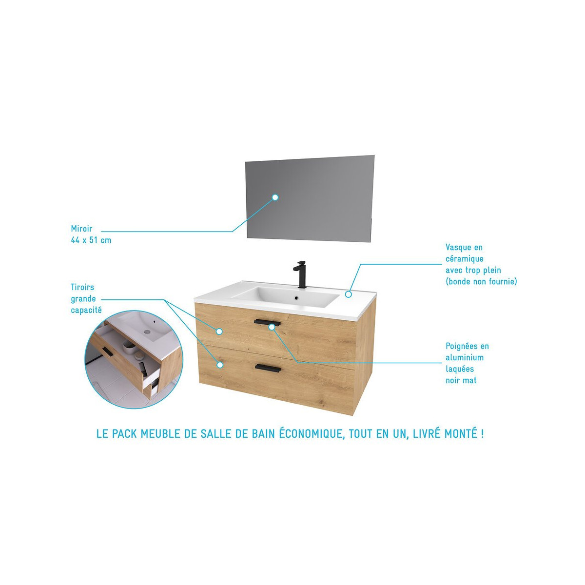 Caractéristiques techniques du BOX-IN 80 WOOD: Dimensions H46xL80xP45cm Caisson BOX-IN 80 WOOD en mélaminé décor bois épaisseur 16mm 2 tiroirs avec façades finition décor bois épaisseur 16mm Fourni avec 2 poignées en aluminium noir mat Vasque: Vasque en céramique avec trop plein Trop plein chromé Perçage pour robinetterie (non-fournie) Robinetterie non-fournie Miroir: Dimensions: 71 x 44cm (L: 71cm x H: 44cm) Miroir à suspendre avec fixation métallique Les Plus produit: Meuble livré monté Prêt à installer Référence: LAV575 Garantie 2 ans pièces et non main d'oeuvre. Des solutions de rangement pour avoir la place de mettre toutes vos envies dans votre salle de bain. Quelle que soit la place dont vous disposez, nous serons à la hauteur ! Remarques importantes : Ces colis sont volumineux, la livraison est effectuée par transporteur spécialisé en bas de chez vous. Les chauffeurs ne sont pas habilités à porter la marchandise, mais uniquement à la décharger. Pas de livraison à l'étage. L'adresse de livraison doit être accessible en camion poids lourd. Dans le cas contraire la marchandise sera mise à disposition au dépôt le plus proche (distance non garantie). Les rendez-vous sont gérés directement par les transporteurs. Attention à bien contrôler la marchandise à reception pour éviter tous litiges. Le meuble est livré monté. Garantie 2 ans pièces uniquement Cocorico ! MyShowerRoom est une entreprise Française et toute la conception de nos produits est également Française. Ce qui est un véritable plus pour être au plus près de ses clients et avoir une meilleure connaissance de leurs attentes. Qui sommes nous L’HISTOIRE DE MYSHOWERROOM Nous avons créé MyShowerRoom en 2003 avec l’ambition de démocratiser le design et l’innovation dans la salle de bain pour faire de cette pièce un lieu à part entière, un véritable lieu d’histoires à vivre pour toute la famille. Nos cabines de douche et meubles de salle de bain dans l’ère du temps à des tarifs très accessibles. Nos nombreux brevets garantissent l’originalité de notre gamme de cabines de douches. Et nos ingénieurs mettent en œuvre tout leur savoir-faire et toutes les technologies innovantes au service d’une simplicité d’installation et d’utilisation incomparable pour tous. ÊTRE BIENVEILLANT AVEC NOS CLIENTS Notre service client a un objectif : rendre nos clients heureux. Pour cela nous veillons à répondre dans les 24h aux demandes clients. Mais aussi de toujours apporter une solution et entière satisfaction à nos clients. CONSTRUIRE DES PRODUITS TOUJOURS PLUS PERFORMANTS Nos ingénieurs, ainsi que nos équipes terrain consacrent tous leurs efforts à créer des produits adaptés à vos besoins, et toujours plus innovants grâce à nos technologies. Notre objectif est d’être votre unique interlocuteur pour tous vos projets de salle de bain. CONCRÉTISER LES RÊVES DE CHACUN Un projet de salle de bain ? Nous le réalisons ! Lieu de détente et de relaxation par excellence, la salle de bain est une des pièces maîtresse de la maison. Chez MyShowerRoom, nous mettons tout en oeuvre afin que ce rêve devienne réalité. PROPOSER UNE GAMME COMPLÈTE DE PRODUITS Nous vous proposons grâce à notre boutique en ligne une gamme complète de produits Made in MyShowerRoom pour équiper, et accessoiriser votre salle de bain. Un catalogue que nous renouvelons régulièrement avec les dernières technologies MyShowerRoom. APPORTER UNE EXPERTISE HUMAINE Parce que l’humain passe avant tout, nous travaillons avec les meilleurs experts. La satisfaction de nos clients est notre seule et unique priorité. Chaque problème a une solution, et c’est dans cette optique que nous avons mis en place un chat pour échanger directement avec nos équipes. NOTRE CENTRE LOGISTIQUE 11 000 m² d’entrepôt 7000 palettes en stock 1 800 colis traités par jour Plus de 260 préparations de commandes quotidiennes 12 quais de chargement/déchargement CONSEILS & VENTES Une équipe disponible 5 jours sur 7 pour vous accompagner dans vos achats. LIVRAISON GRATUITE Pour toute commande sur le site MyShowerRoom, la livraison est gratuite dans toute la France. UNE GARANTIE DE QUALITÉ Grâce à nos produits brevetés vous bénéficiez de produits uniques. Référence produit: LAV575 Retrouvez plus d'informations produit et des conseils de montage sur le site Aurlane. Remarques importantes: Ces colis sont volumineux, la livraison est effectuée par transporteur spécialisé en bas de chez vous. Les chauffeurs ne sont pas habilités à porter la marchandise, mais uniquement à la décharger. Pas de livraison à l'étage. L'adresse de livraison doit être accessible en camion poids lourd. Dans le cas contraire la marchandise sera mise à disposition au dépôt le plus proche (distance non garantie). Les rendez-vous sont gérés directement par les transporteurs. Attention à bien contrôler la marchandise à réception pour éviter tous litiges.