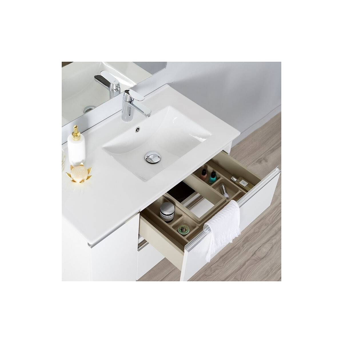 Cet ensemble de salle de bain est composé d'un meuble de 85 cm, d'un plan vasque, d'un miroir et de l 'éclairage. MEUBLE : - Meuble en panneau de particules mélaminé laqué avec peinture haute brillance UV - épaisseur 16 mm - Façade en panneau de particules mélaminé laqué avec peinture haute brillance UV - épaisseur 16 mm - Finition des caissons et des façades de tiroirs laqués blanc brillant - Meuble équipé de deux tiroirs avec rail dissimulé à extraction partielle en aluminium brillant - fermeture soft close et réglable en hauteur et d'une porte avec tablettes de rangement. - Poignée finition aluminium brillant - Meuble à suspendre - Ce meuble intègre un vide sanitaire pour faciliter le passage des évacuations - Meuble livré monté - Dimensions : L84.8 x H54 x P45 cm + Produit du meuble: Facilité de nettoyage grâce aux finitions peintures laquées. Bonne capacité de stockage grâce aux 2 tiroirs et au séparateur de rangement inclus dans le meuble. PLAN VASQUE : - Plan vasque en porcelaine blanc de 85 cm - Cuve décentrée à droite - Plage de dépose pour rangement - Plage de robinetterie et trop plein - Dimensions : L85.5xH1.6xP47 cm - La robinetterie et le système de vidage non fournis + Produit de la porcelaine: Très résistante aux rayures et a une utilisation très régulière, sans perde sa brillance. Haute résistance aux produits d'entretiens corrosifs. MIROIR : - Applique Led inclus - Dimensions : L80 x H80 x P5 cm ÉCLAIRAGE : - Applique Led Dimension de l'applique : L20.8 x H3.2 x P11.2 cm INSTALLATION FACILE : Meuble 100% monté en usine Fabrication Europe Garantie 2 ans
