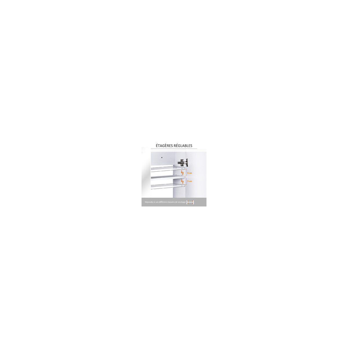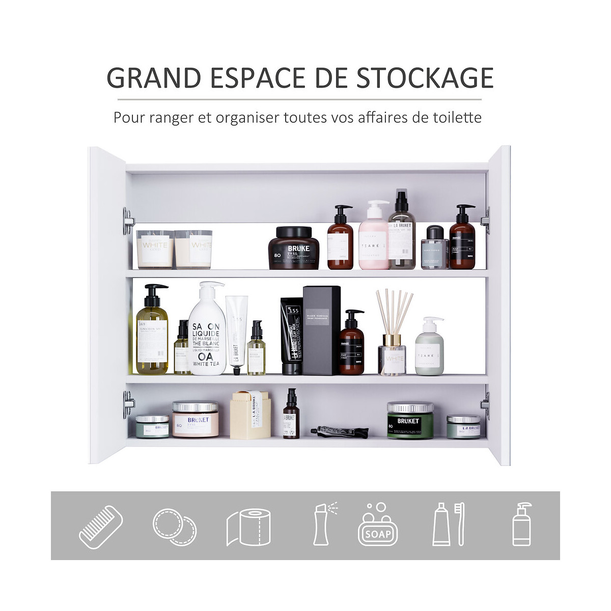 Cette armoire de toilette murale avec miroir peut être installée aussi bien dans votre salle de bain que dans vos toilettes. Vous pourrez y mettre des produits de beauté, des médicaments, des produits d'entretien, etc... Caractéristiques : - Armoire de toilette murale avec miroir : design contemporain mélant sobriété et élégance - Portes à ouverture fermeture pratique et silencieuse avec charnières robustes et tampons - Miroir frontal idéal pour se maquiller, se raser, se coiffer, etc... - 2 étagères (dont une réglable en hauteur), 3 niveaux de rangement - Fixation murale d'une grande simplicité - Compacte, peu encombrante pour installation même dans les petits espaces (WC, salle d'eau) Spécifications : - Matériaux principaux : MDF, verre - Couleur cadre : blanc - Dimensions totales : 80L x 15l x 60H cm - Épaisseur verre : 0,4 cm - Charge max. recommandée : 15 Kg - Livraison effectuée en un colis - Réf. : 834-044