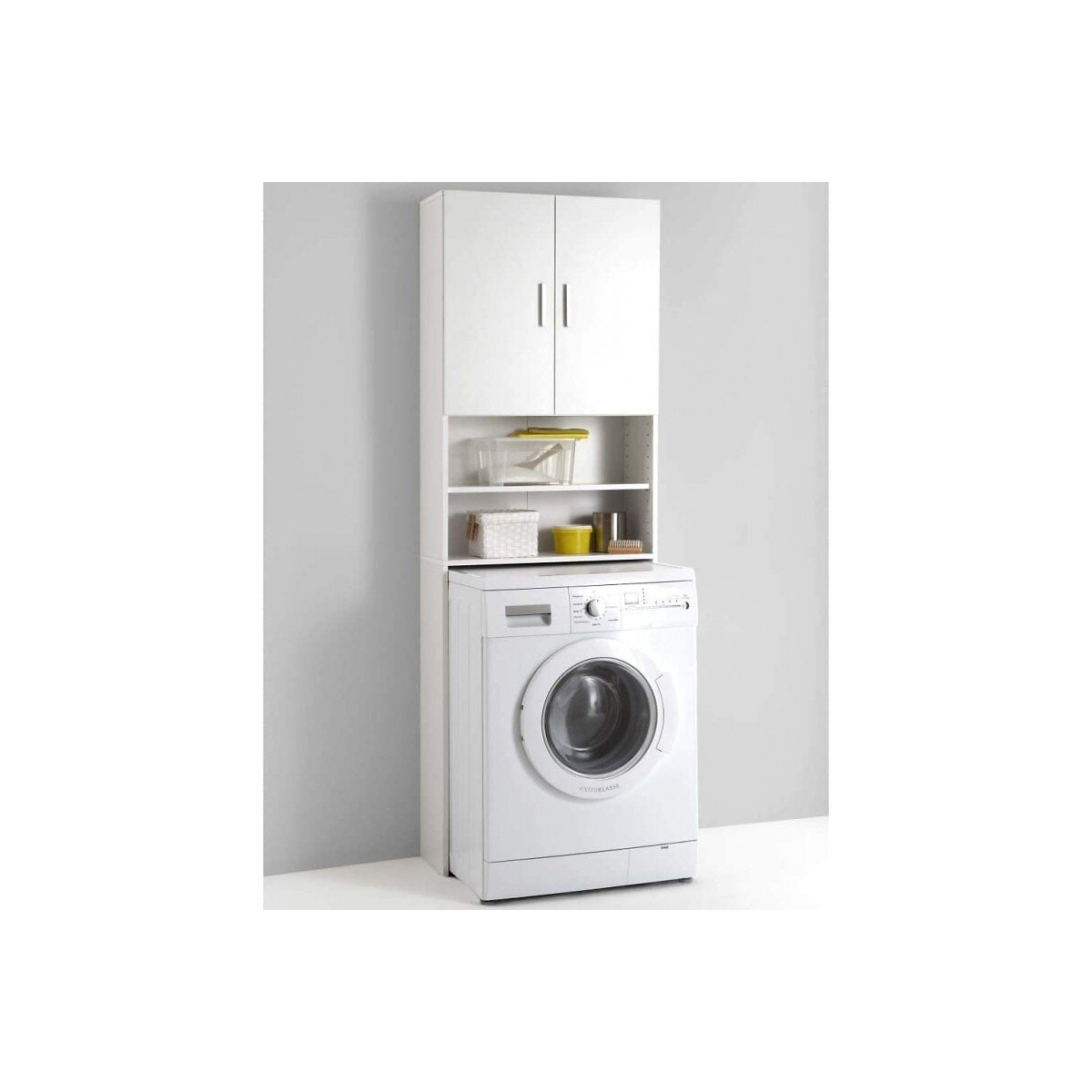 Armoire pour machine à laver. Idéal pour un gain de place optimal avec cette armoire pour machine à laver, vous pouvez utiliser au mieux l'espace de votre machine à laver. Il offre une énorme place directement au-dessus de la machine à laver, les articles de toilette, les produits de nettoyage et d'autres objets utiles. Couleurs : Contenu : 1 armoire pour machine à laver. Détails techniques : Armoire pour machine à laver. Couleur : Béton blanc mat - Dimensions : 190 x 64 x 26 cm (H x l x P) - Poids : 24 kg - Matériau : Panneau de particules de 12 mm avec revêtement en mélamine. Dimensions : 64 x 26 x 190 cm, Finition: panneaux mélaminiquesSpécifications techniques