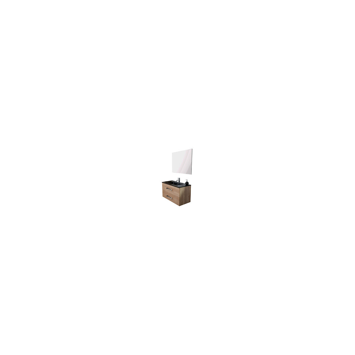 La gamme LENCA propose une offre composée d'un meuble à suspendre et son miroir assorti et d'un demi colonne à suspendre. Bois et résine noire s'associent dans ce meuble à l'esprit contemporain et industriel souligné par des poignées au design affirmé alliant chrome et coloris noir. Meuble à suspendre disponible en dimension 90cm. Finition mélaminé effet bois de cerisier miel. Poignées chromés et noires design. Plan vasque résine finition noire mat, épaisseur 30mm, vasque moulée avec trop plein. Vasque simple pour 90cm. Miroir simple et non éclairant associé au meuble, collé sur panneaux de particules 16mm, chants finition aluminium. Miroir à suspendre. Dimension 90x70cm. Livré monté. Fabrication Européenne. Norme PEFC 10-31-3151. Ce produit de la collection Zen à Vivre vous assure un confort sans égal et vous permet profiter de votre intérieur en toute serenité.Spécifications techniques