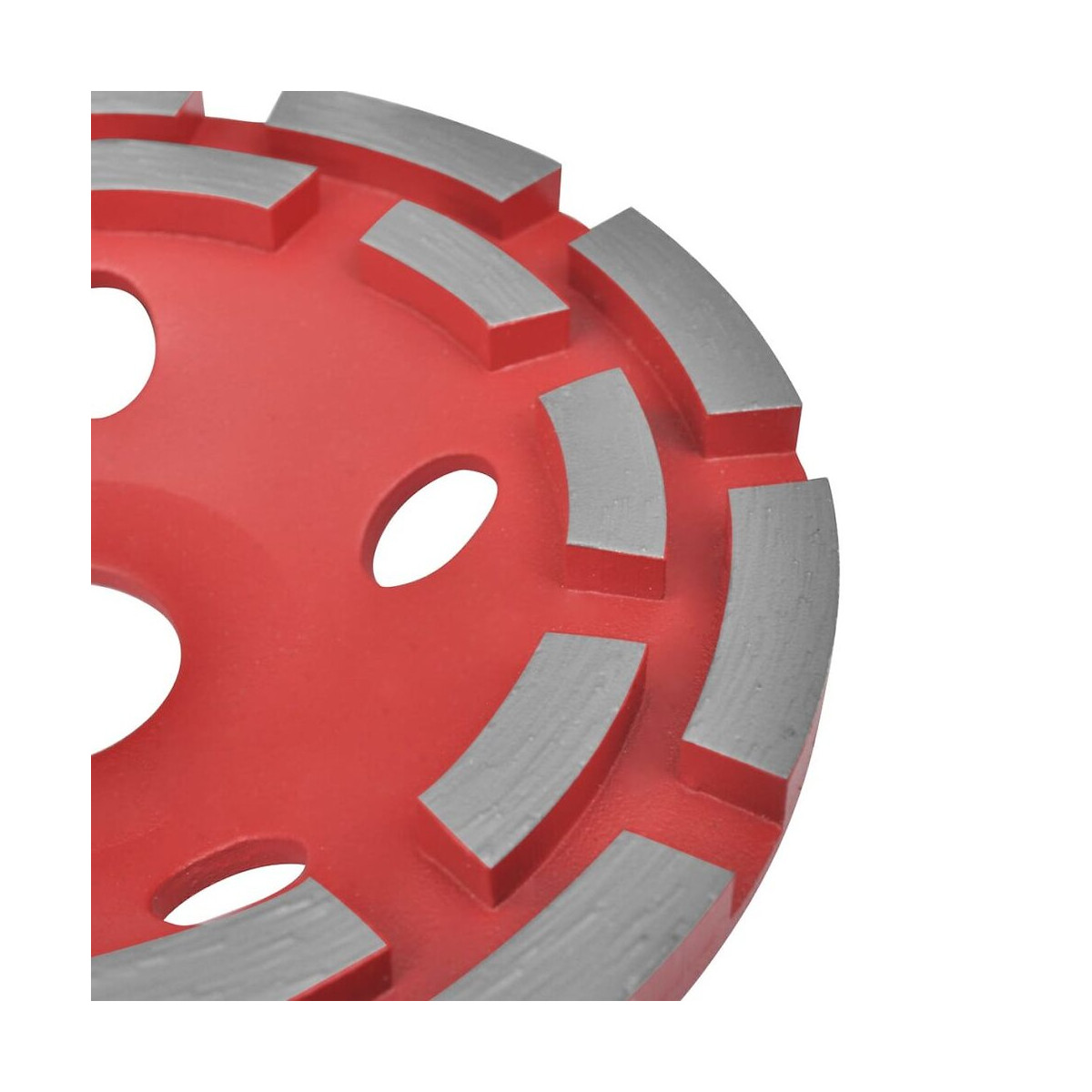 Cette meule assiette à double rangée, d'un diamètre de 180 mm, est utilisable sous arrosage ou à sec. Il est idéal pour la préparation de surface et la finition de béton. Cette meule sans vibration est très légère ce qui réduit la fatigue de l'utilisateur. Les trous permettent à l'air de circuler afin de refroidir la meule assiette rapidement et efficacement. Grâce à son revêtement diamanté de 20mm de largeur, notre meule assiette est extra durable, ce qui vous assure un décapage efficace, une bonne performance et des années d'utilisation. Matériaux: acier + revêtement diamanté Diamètre total : 180 mm Diamètre des trous: 22,2 mm Largeur du segment diamanté: 20 mm Epaisseur du segment: 5 mm Vitesse linéaire: 60 m / s