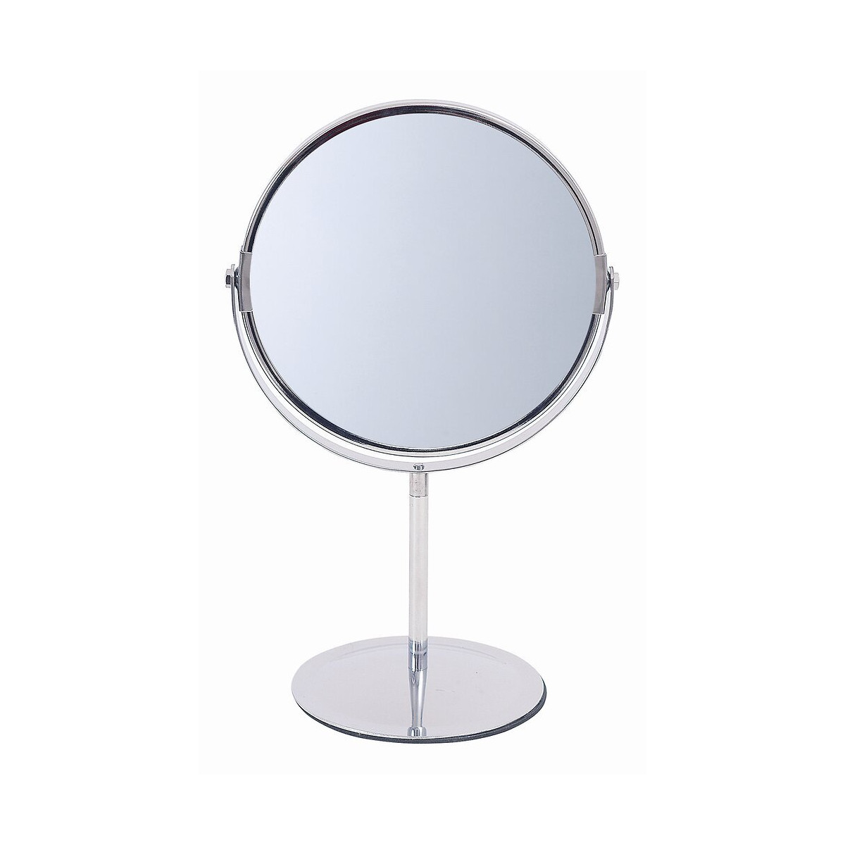 - Miroir cosmétique Manon de forme ronde à poser. - Encadrement en métal finition chromée. - Miroir pivotant, double face : 1 face miroir, 1 face grossissante x 2. - À assembler soi-même. Dimensions du miroir (hors encadrement) : Diamètre 16 cm x Épaisseur 0,2 cm. - Dimensions totales : Hauteur 30 cm x Largeur : 17,5 cm x Diamètre de la base 12,5 cm.