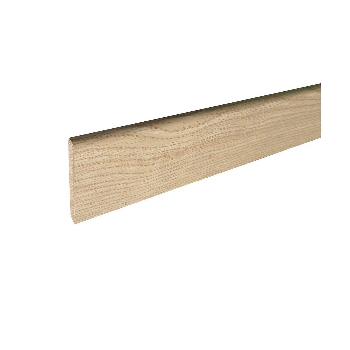 Plinthe arrondie. MDF revêtu papier chêne naturel. Dimensions : L.2400 x l.70 x E.10 mm.
