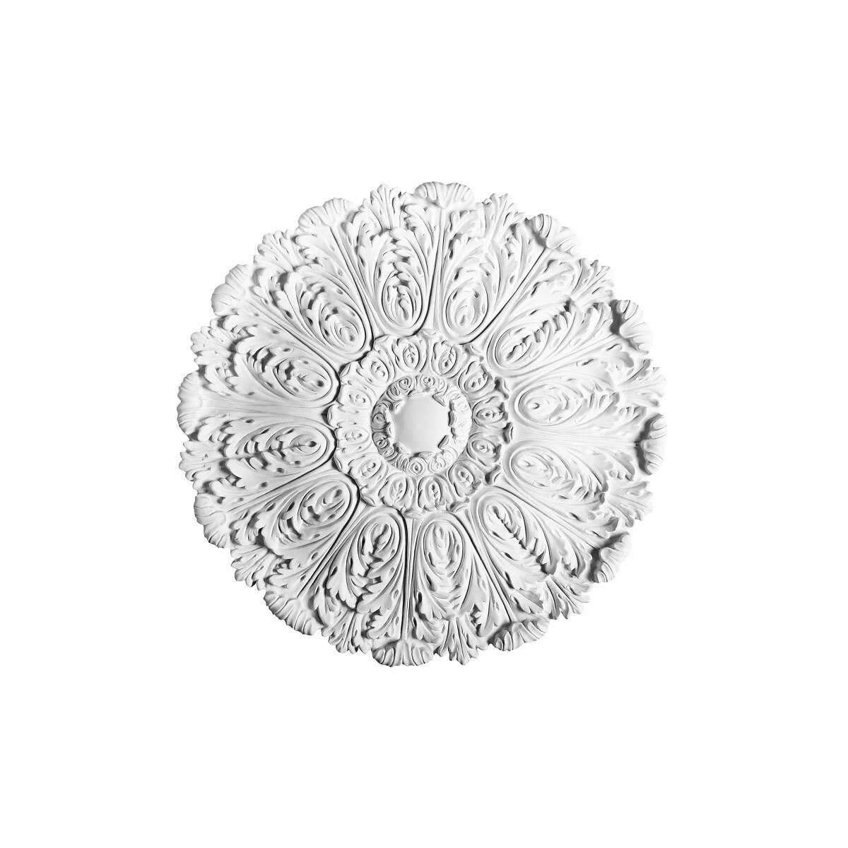 Grande rosace R27 décorée de motif de feuilles d'acanthe. Cette décoration viendra embellir vos plafonds ou même vos portes et vos murs et apportera du caractère ainsi qu'un style élégant et chaleureux à votre intérieur. Vous pouvez compléter le look de votre pièce avec,par exemple, des plinthes SX138 et des corniches C333. Remarque : il est nécessaire de visser la rosace au mur ou au plafond. Ce produit peut également être peint pour répondre à vos besoins, dans le coloris de votre choix ! N'hésitez pas à calculer les quantités de colles nécessaires (FDP500 ou FDP700) grâce au calculateur de colles en ligne facile à utiliser. Vous pouvez aussi faire appel à notre bureau d'études si vous en ressentez le besoin