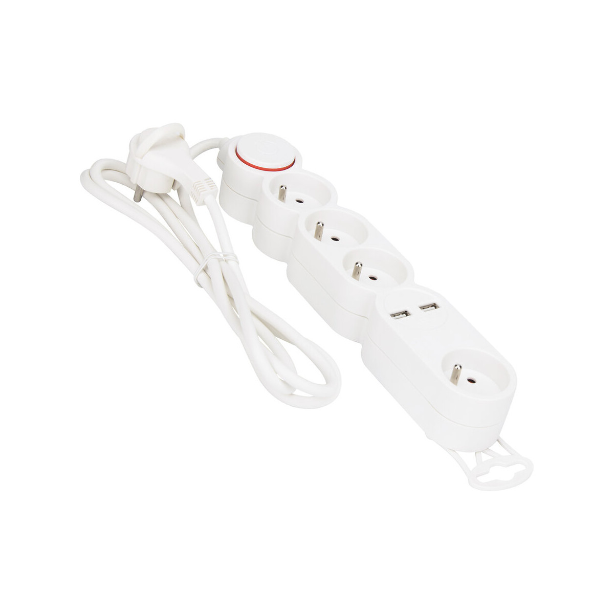 Bloc 4 prises + 2USB BLANC 5V DC Max.2.1A(10.5W), Câble HO5VV-F 3G1 1.5m avec fiche plate McKENZIE.Spécifications techniques