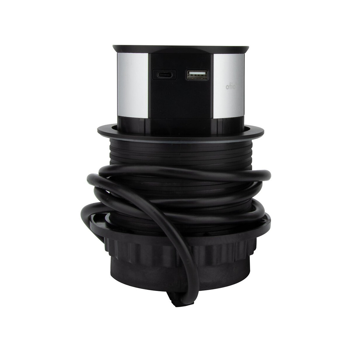 Chargez votre smartphone rapidement et sans câble ! Design et compacte, cette multiprise escamotable équipée de 3 prises 16A et deux ports USB (USB et USBC) s'encastre et se relève d?une simple pression des doigts. Pour recharger votre smartphone par induction sans utiliser de câble, posez simplement votre téléphone sur le bloc prises. Les deux ports USB (dont un USB-C) vous permettent également de recharger plusieurs appareils en simultané. Grâce aux trois prises 16A disponibles, vous pourrez brancher plusieurs appareils en même temps et ainsi bénéficier d'un important gain de place sur votre plan de travail. Caractéristiques techniques : 3 prises 16A 2P+T, chargeur induction jusqu?à 10W, câble H05VV-F 3G1,5mm² : longueur 1,5m, diamètre de perçage: 100 mm, Encombrement sous plan de travail 10 cm, Hauteur déplié : 6cm.