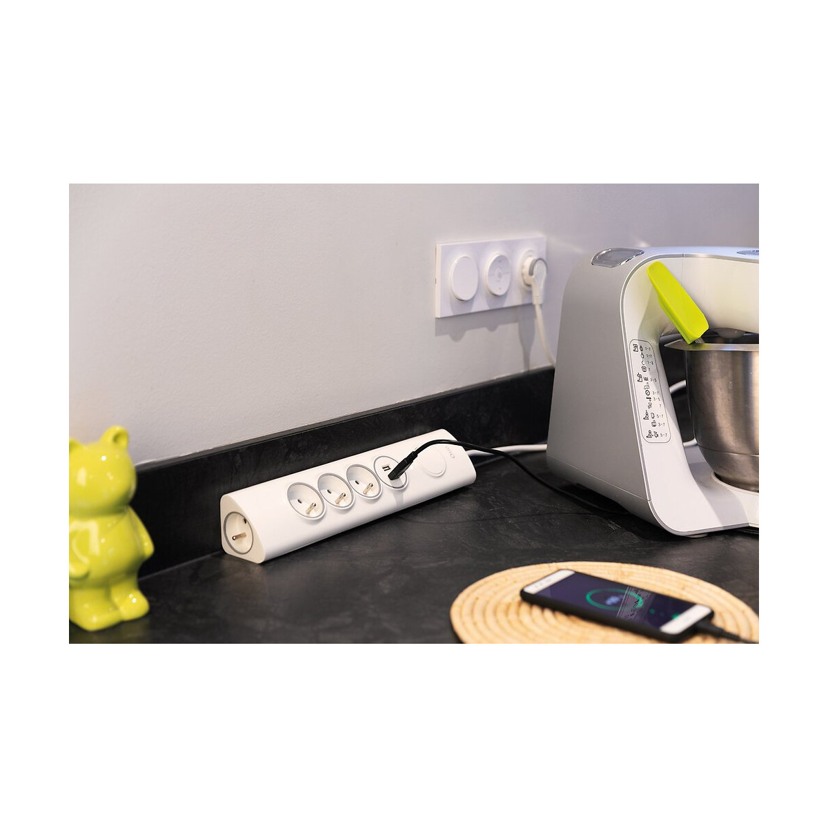 Ce bloc multiprises au design astucieux est idéal pour la cuisine, le bureau ou le salon. Il offre confort d'utilisation et protection pour tous les appareils électriques et multimédia contre les surtensions et la foudre. Pratique, il est muni d'une prise latérale pour brancher un chargeur sans encombrer les autres prises et de deux ports USB pour le chargement rapide de vos appareils nomades. Il est également doté d'un interrupteur qui vous permettra de réaliser des économies en éteignant tous les appareils d'un seul geste. Son installation est simple et s'effectue rapidement en fixant la multiprise grâce à sa platine arrière qui est démontable. Ce modèle est à câbler en HO5VV-F 3G1,5mm². Câble électrique non fourni.