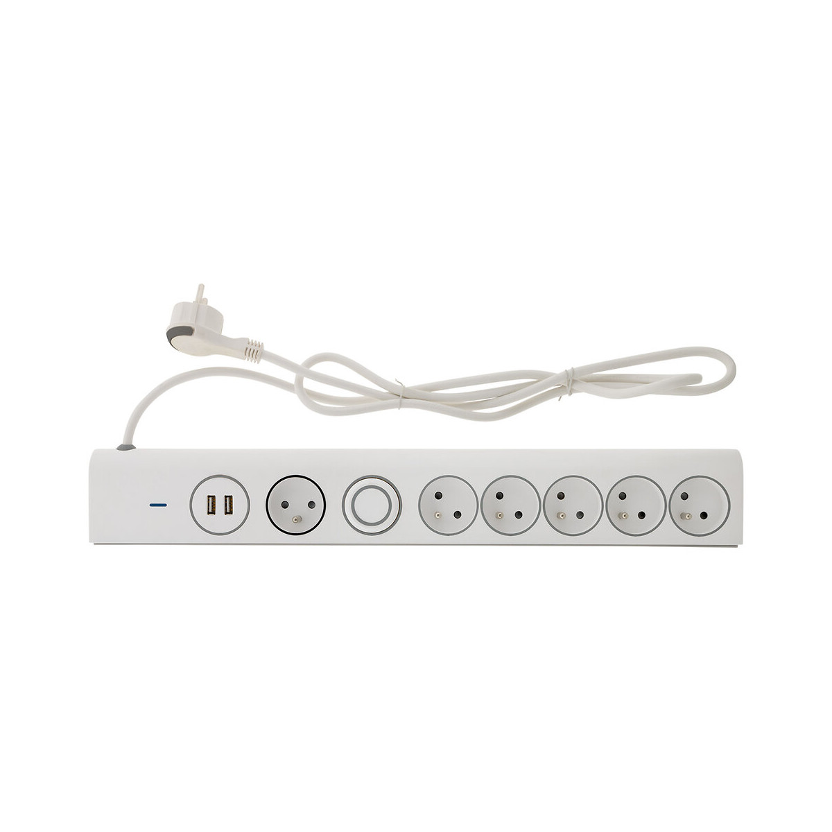 Cette multiprise au design intelligent vous assure une protection optimale de tous vos appareils électriques et multimédia contre les surtensions et le risque de foudre. Très pratique au quotidien, elle est pourvue de deux ports USB permettant de charger rapidement l'ensemble de vos équipements nomades. Un interrupteur vous permet de choisir quelle prise éteindre ou allumer. Dotée d'une fiche extraplate et d'une sortie de câble rotative sur le côté, elle est également pourvue de patins antidérapants. Le côté latéral plat de la multiprise vous permet de la positionner de façon horizontale ou verticale au plus près du mur. Caractéristiques: 2 ports USB 2.4A chargement rapide, Puissance maxi : 3 680W sous 230V~, Type de câble : HO5VV-F- 3G1mm², Pointe de courant max : 19.500A - 775V, Niveau de protection Up : 1 800V, Tension max de circuit ouvert Uoc:6 000V, Longueur du câble : 1,9 m environ.