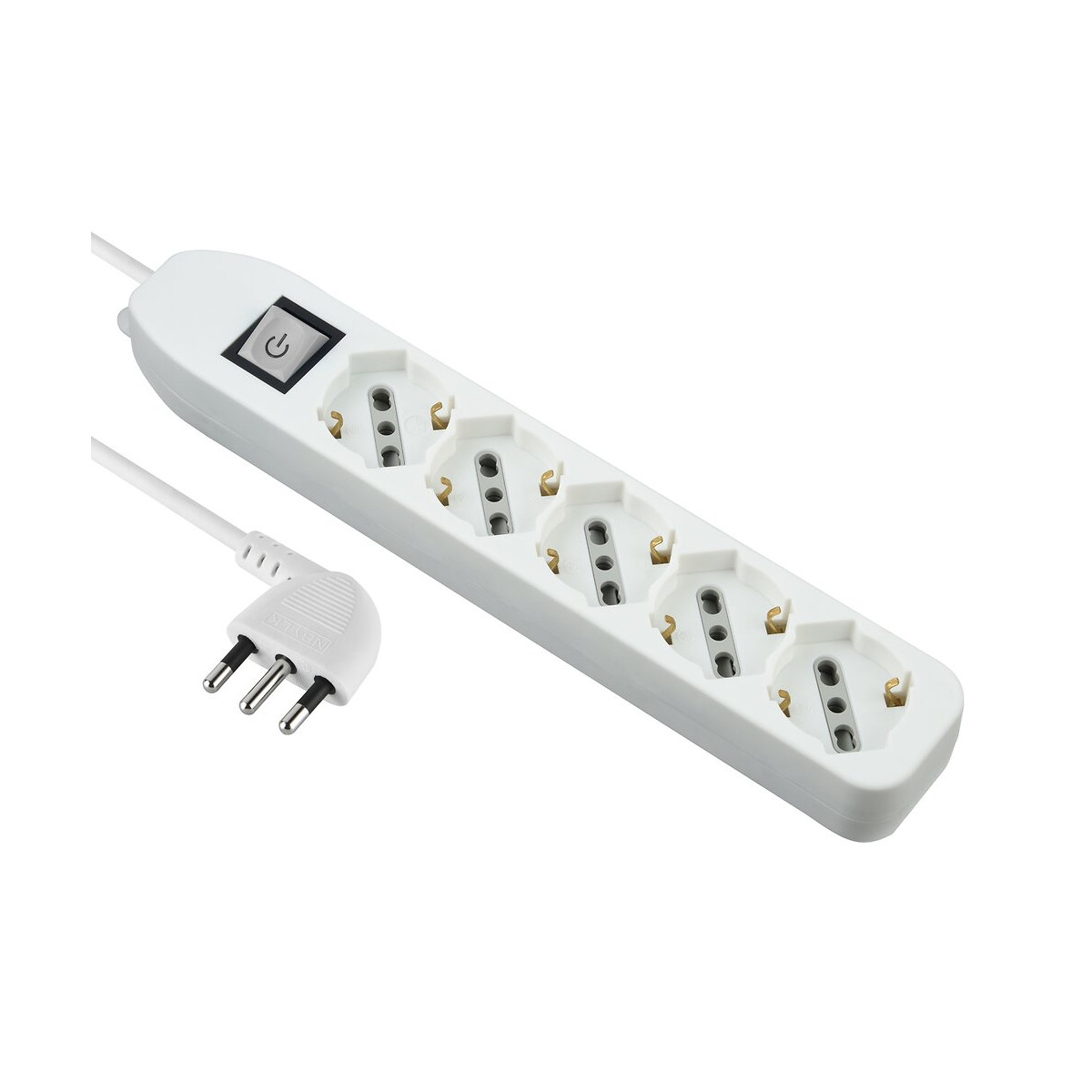 Multiprise avec 5 prises multifonction (schuko + 16A + 10A). Fiche 16A et câble H05VV-F 3G1 mm², longueur: 1,5 mètre. Indicateur lumineux ON / OFF. Toutes les prises sont équipées d'une protection enfant: elle empêche l'introduction de corps étrangers dans la prise sous tension. Produit certifié; blanc opaque.