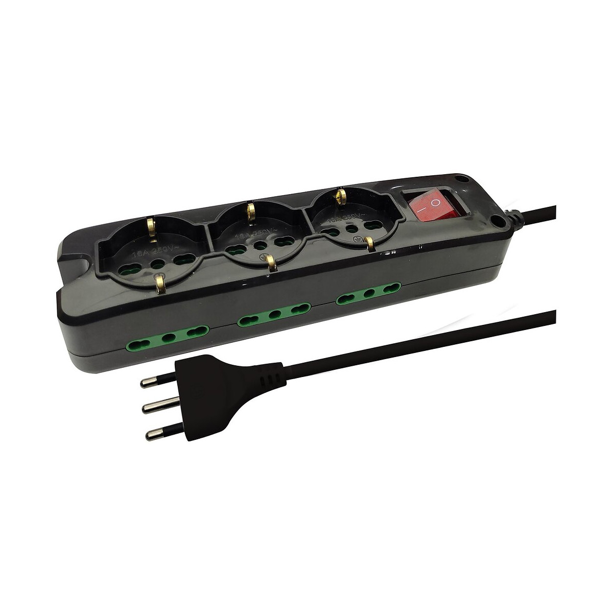 Multiprise avec 3 prises polyvalentes (schuko + 16A + 10A) et 6 prises bivalentes 10 / 16A. Fiche 16A et câble de 1,5 m H05VV-F 3g 1mm2; max 3500W. Avec indicateur lumineux ON / OFF et interrupteur. Protection enfants: empêche l'introduction de corps étrangers dans la prise sous tension; produit certifié. Couleur: noir mat.