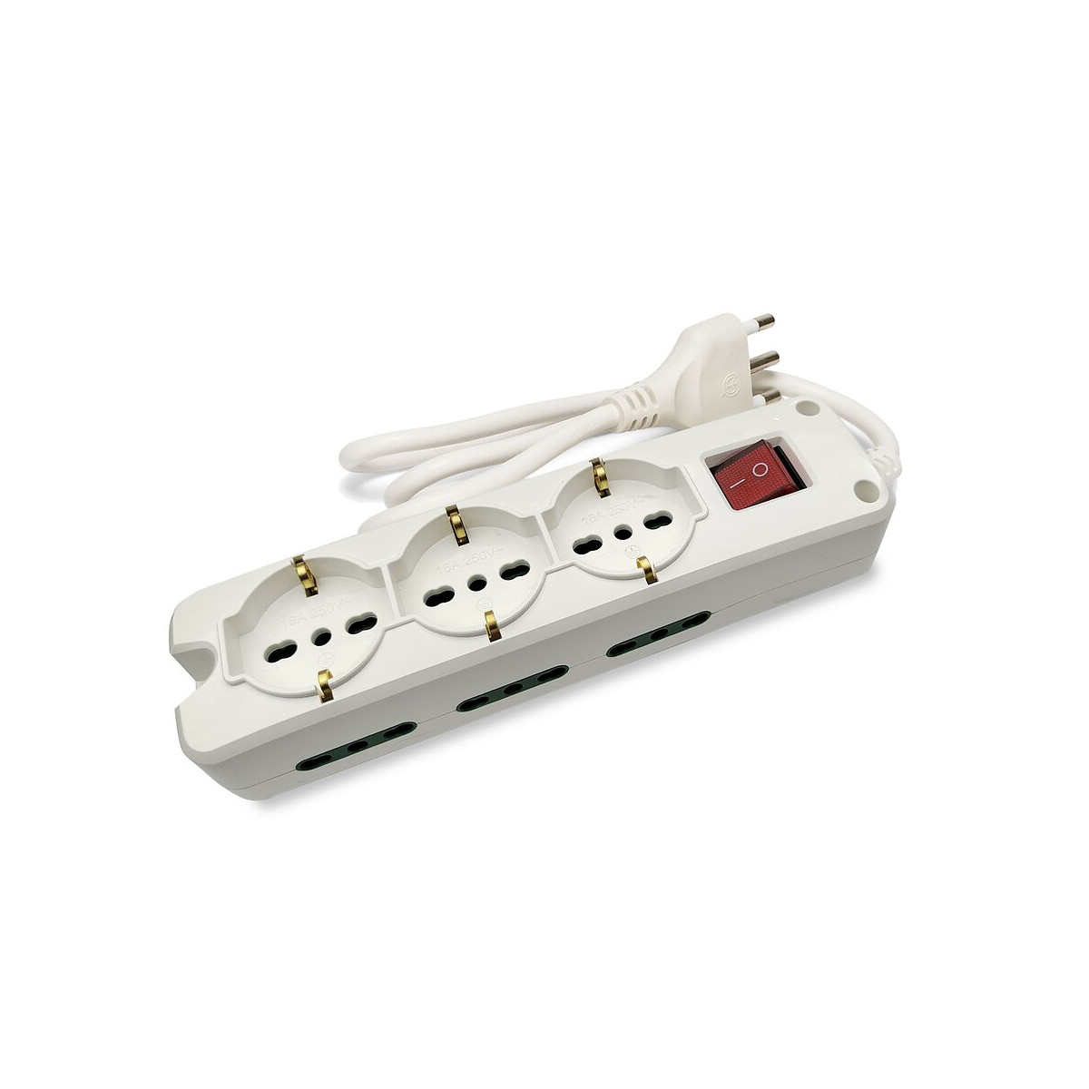 Multiprise avec 3 prises polyvalentes (schuko + 16A + 10A) et 6 prises bivalentes 10 / 16A. Fiche 16A et câble de 1,5 m H05VV-F 3g 1mm2; max 3500W.Avec indicateur lumineux ON / OFF et interrupteur. Protection enfants: empêche l'introduction de corps étrangers dans la prise sous tension; produit certifié. Blanc opaque.