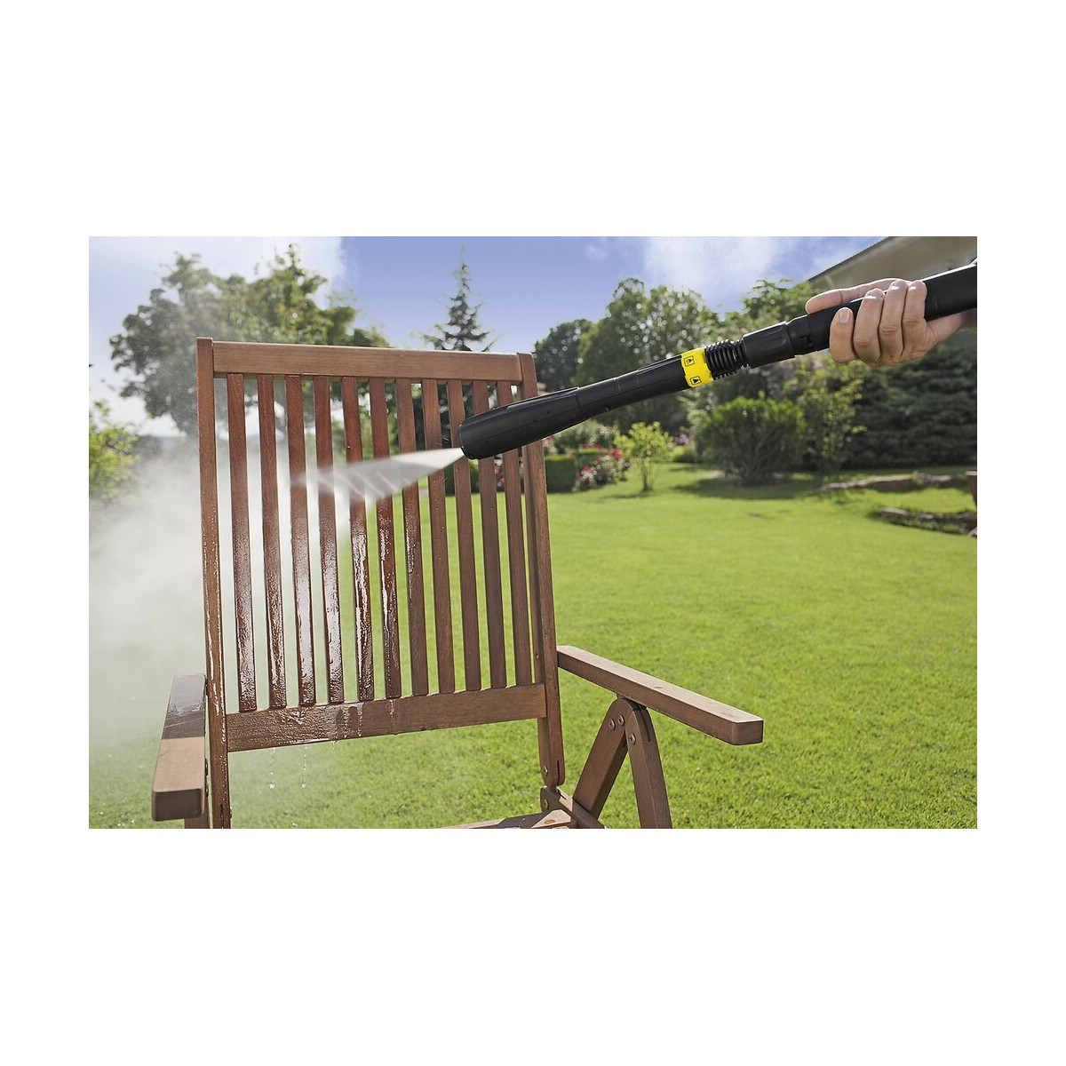 5 formes de jets différents (jet basse pression, jet plat haute pression, buse rotative, jet crayon et jet plat large à pression réduite) sans changer de lance pour un nettoyage plus efficace et plus rapide des escaliers extérieurs, murets, portes de garage... Le changement s'opère simplement en tournant la lance.