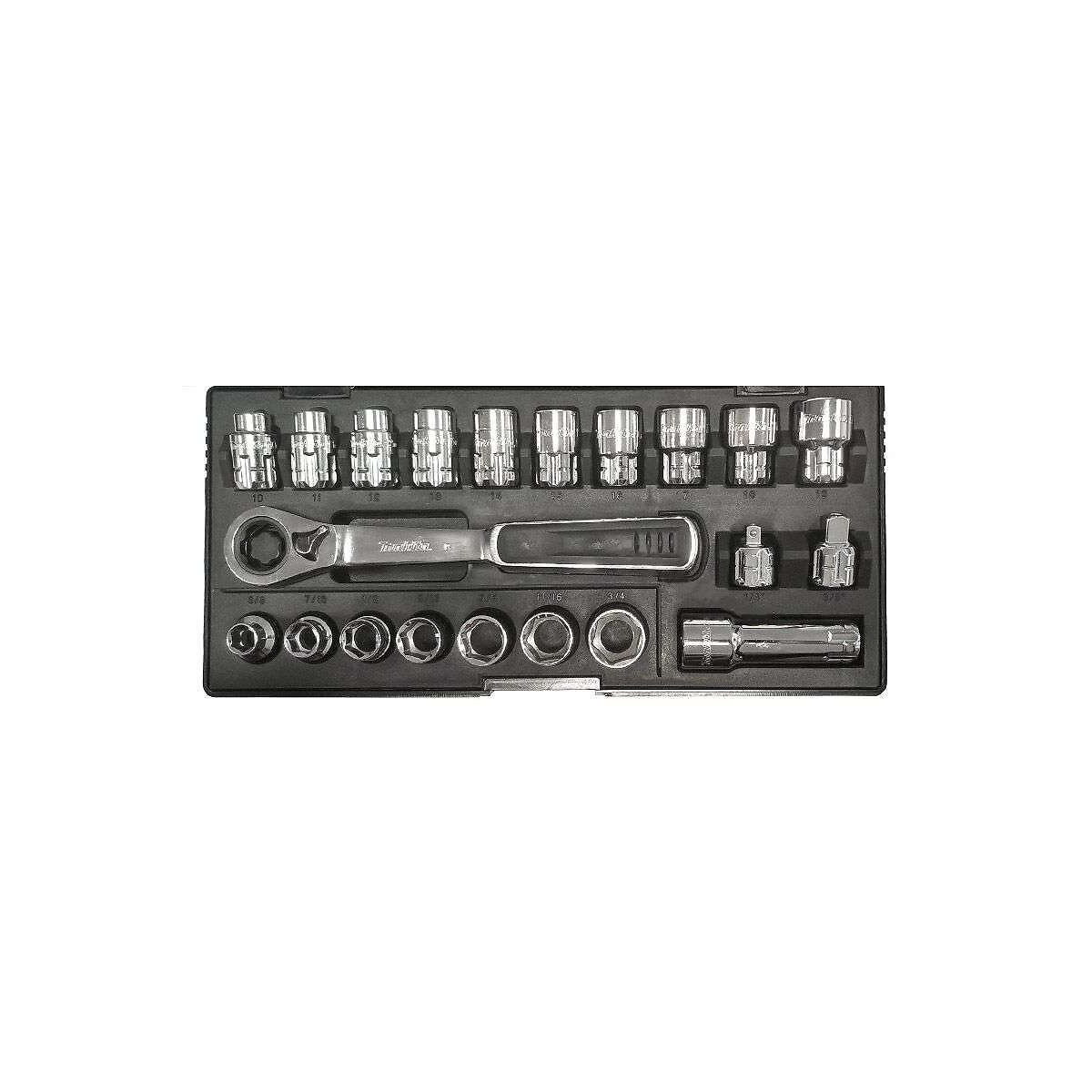 Coffret Clé à cliquet douilles traversantes métriques et en pouces MAKITA B-65604 1 x Cliquet à douille traversante 72 dents 1 x Adaptateur 1/4' 1 x Adaptateur 3/8' 10 x Douilles - 10, 11, 12, 13, 14, 15, 16, 17, 18, 19 mm 7 x Douilles en pouces - 3/8', 7/16', 1/2', 9/16', 5/8', 11/16', 3/4' 1 x Rallonge - 75 mm Nombre de pièces : 21