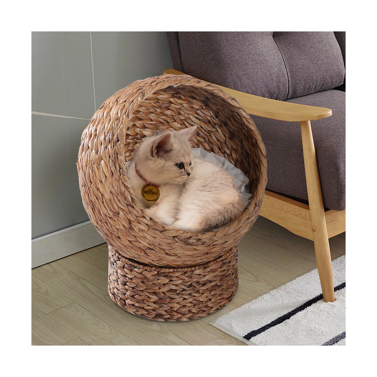Fabriqué en feuilles de bananier et fourni avec un grand coussin en coton d'une grande douceur, ce panier pour chat deviendra rapidement son petit coin repos préféré ! Grâce à son design original en forme de boule, ce panier attirera fortement votre chat et ajoutera une touche d'originalité et de rafinement supplémentaire à votre intérieur. Caractéristiques : - Espace confortable pour votre chat où il peut se reposer, se cacher ou dormir - Fabriqué en feuilles de bananier assurant légèreté et perméabilité à l'air - Niche principale en forme de boule, design original pour attirer l'attention de votre chat et sublimer votre intérieur - Large base dim. 28,5L x 15l cm pour une stabilité optimale + grande entrée afin de faciliter l'accès au panier - Coussin amovible en coton grande douceur (peluche courte) pour un maximum de confort - Cerclage métal offrant plus de rigidité et sécurité Spécifications : - Couleurs principales : marron (panier), beige (coussin) - Matériaux principaux : feuilles de bananier, coton, métal - Dim. totales : 42L x 33l x 52H cm - Dim. niche ronde : 42L x 32l x 33H cm - Dim. base : 28,5L x 15l cm - Dim. coussin : 40L x 40l x 2,5H cm - Charge max. recommandée : 10 Kg - Livraison effectuée en un colis - Réf. : D30-105Spécifications techniques
