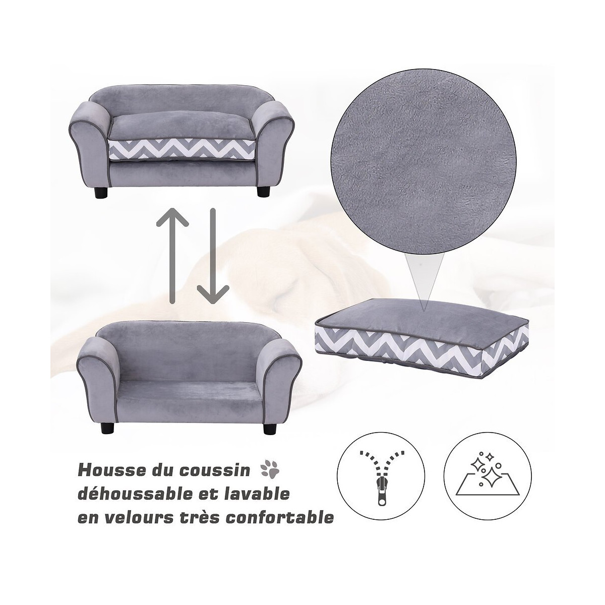 Canapé Chien Chat Sur Pied Style Graphique Contemporain Coussin Amovible Lavable Grand Confort 74l X 41l X 33h Cm Gris Blanc