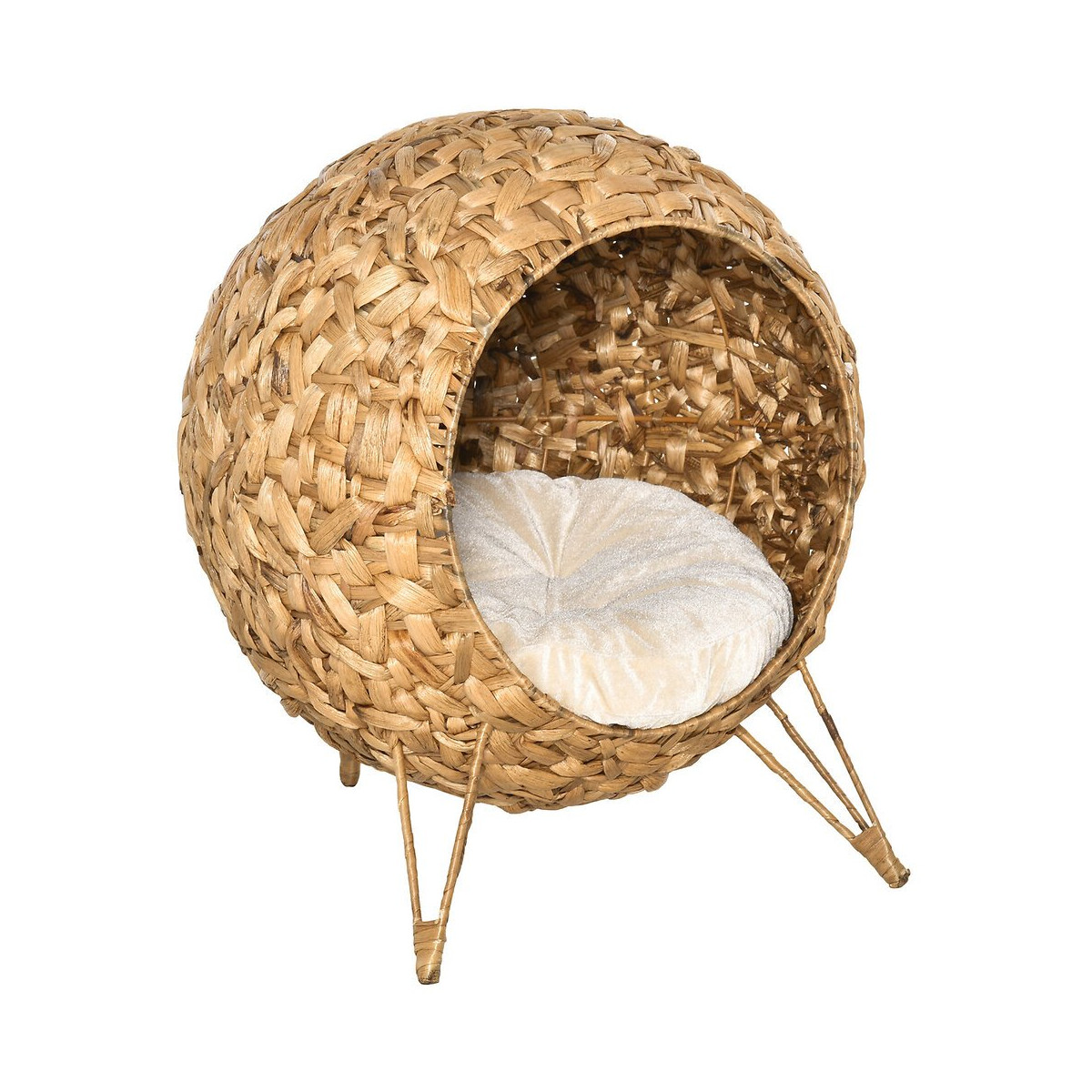 Fabriqué en jacinthe d'eau et fourni avec un grand coussin en coton d'une grande douceur, ce panier pour chat deviendra rapidement son petit coin repos préféré ! Grâce à son design original en forme de boule, ce panier attirera fortement votre chat et ajoutera une touche d'originalité et de rafinement supplémentaire à votre intérieur. Caractéristiques : - Espace confortable pour votre chat où il peut se reposer, se cacher ou dormir - Fabriqué en jacinthe d'eau assurant légèreté et perméabilité à l'air - Niche principale en forme de boule, design original pour attirer l'attention de votre chat et sublimer votre intérieur - Niche montée sur trépied : stabilité optimale + grande entrée afin de faciliter l'accès au panier - Coussin amovible en lin et coton grande douceur (peluche courte) pour un maximum de confort - Cerclage métal offrant plus de rigidité et sécurité Spécifications : - Couleur principale : jacinthe d'eau naturelle - Matériaux principaux : jacinthe d'eau, polyester, coton, métal - Dim. totales : Ø 52 x 58H cm - Dim. niche ronde : Ø 38 cm - Ø coussin : 50 cm - Charge max. recommandée : 10 Kg - Livraison effectuée en un colis - Réf. : D30-245V04Spécifications techniques