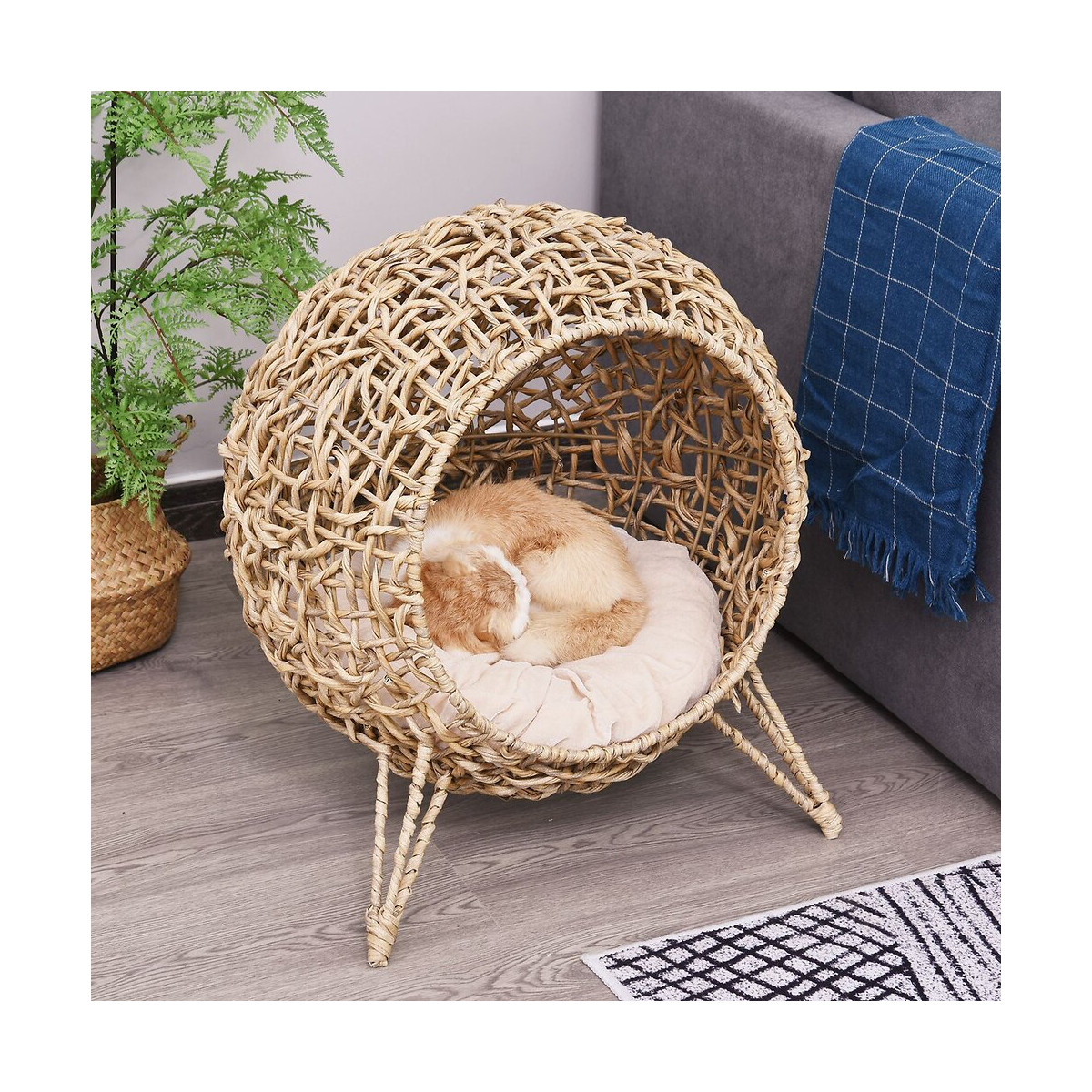 Panier Chat Lit Chat Cosy Grand Confort Dim. Ø 52 X 58h Cm Coussin Moelleux Inclus Résine Tressée Imitation Rotin Beige