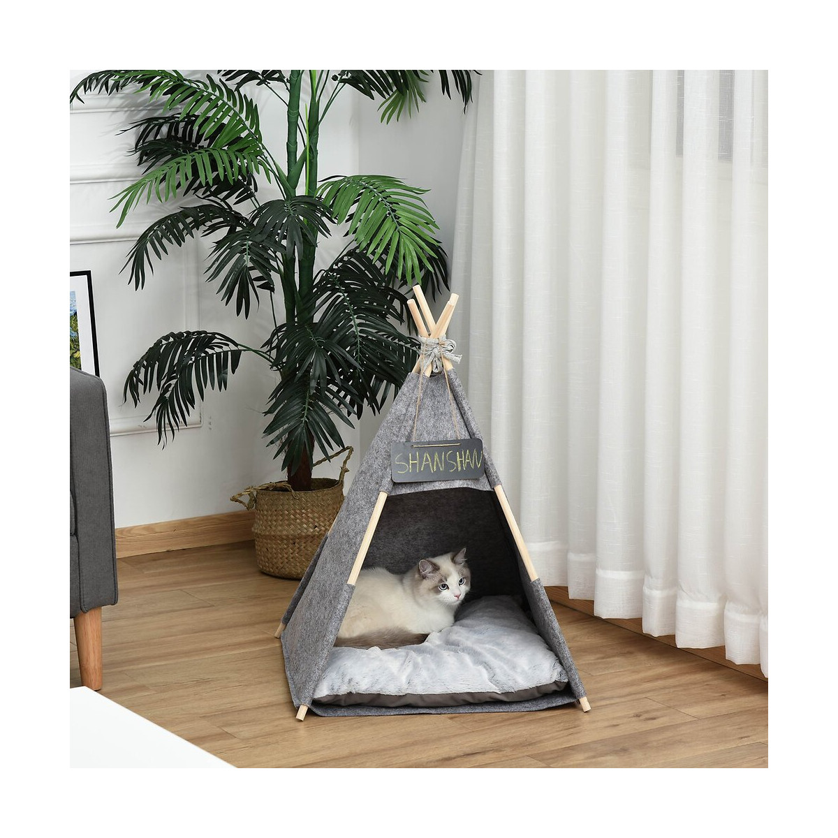 Ce tipi pour animaux de compagnie de PawHut offre à votre compagnon un endroit chaleureux et confortable. Fabriqué à partir de matériaux de qualité, durables et faciles d'entretien, ce tipi est accompagné d'un coussin épais et moelleux pour plus de confort. Votre animal de compagnie pourra y passer toute la journée pour se reposer et jouer. Caractéristiques : - Tente pour animaux de compagnie, tente tipi très élégant, idéal pour ajouter une touche d'originalité à l'espace de votre choix (extérieur ou intérieur) - Tente maison pour chat ou chien coloris gris pour plus de modernité - Offrez un superbe espace de vie pour le plus grand confort de votre animal de compagnie - Grande entrée/sortie, votre chat se sentira comme à la maison ! - Epais coussin moelleux inclus, offre à votre animal un endroit chaleureux pour se reposer et jouer - Pratique, le coussin et le feutre peuvent être lavés en machine - Fabriqué en bois de pin de qualité et en feutre durable, ce tipi est sûr et robuste pour un usage quotidien - Ensemble complet : 1 x tente, 4 x poteaux en bois de pin, 1 x coussin épais, 1 x corde et 1 x ardoise inclus - Convient aux chats et chiens de moins de 6 Kg - Montge facile, rapide à l'aide du manuel d'assemblage illustré fourni Spécifications : - Couleur : gris - Matériaux principaux : feutre, peluche PV (100% fibre de polyester), pin - Dim. totales : 58L x 58I x 80H cm - Dim. de l'espace intérieur : 55L x 55I x 60H cm - Dim. porte : 55 L x 40 H cm - Dim. coussin : 55L x 55I x 3T cm - Dim. pliées : 90L x 26I x 10H cm - Livraison effectuée en un colis - Réf. : D30-386Spécifications techniques
